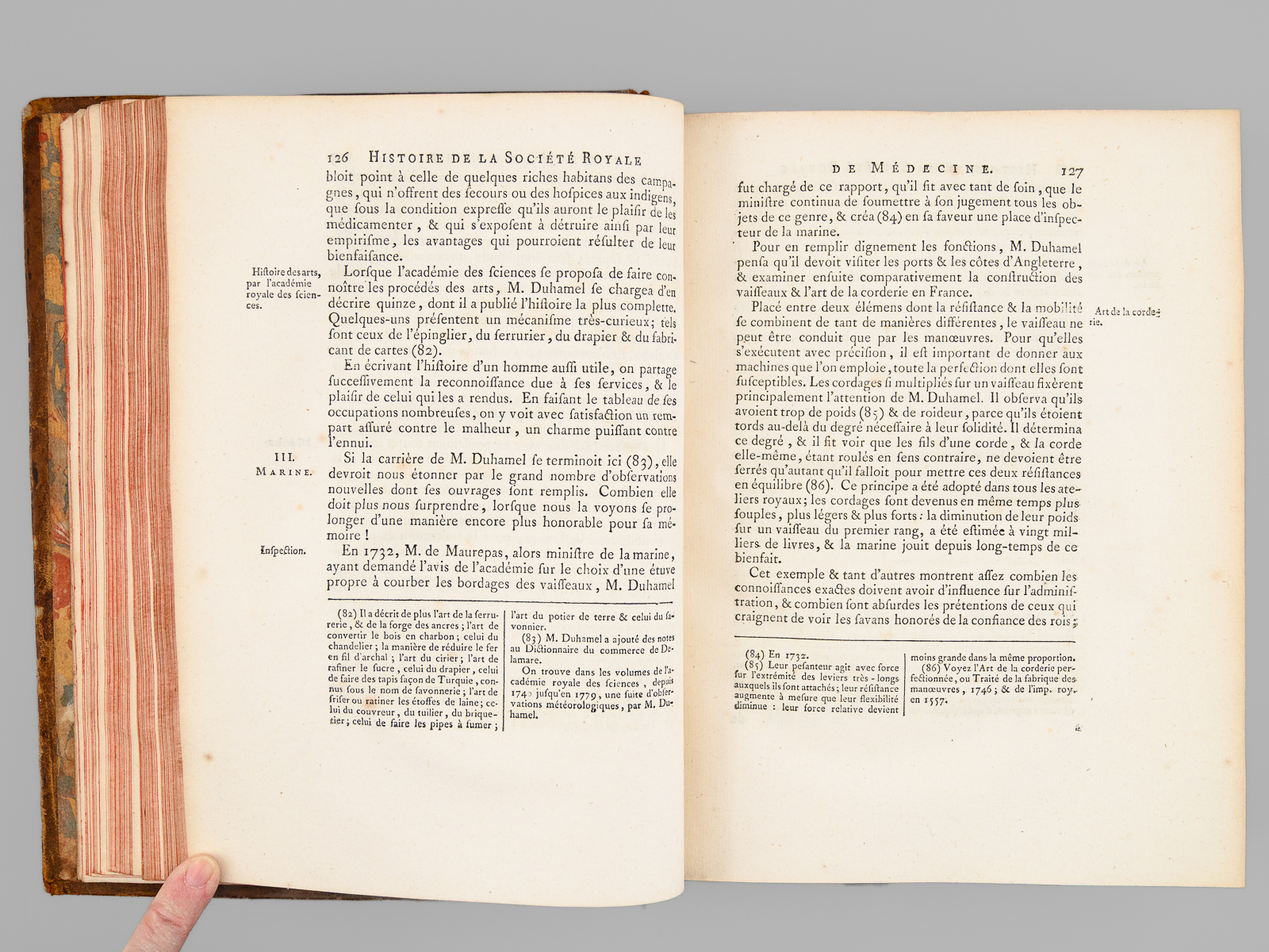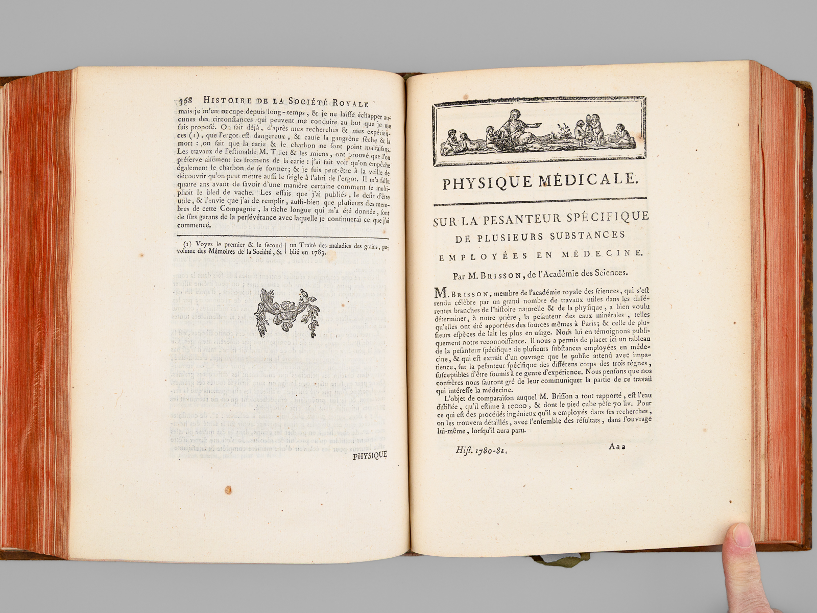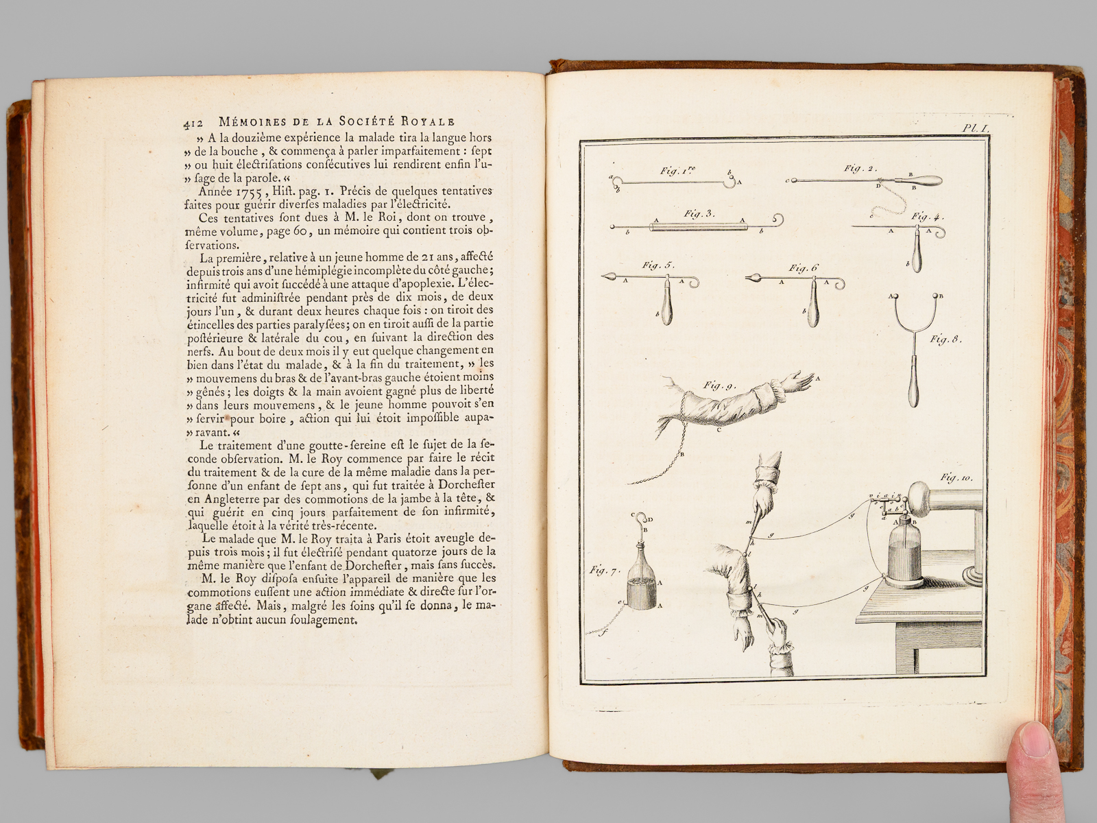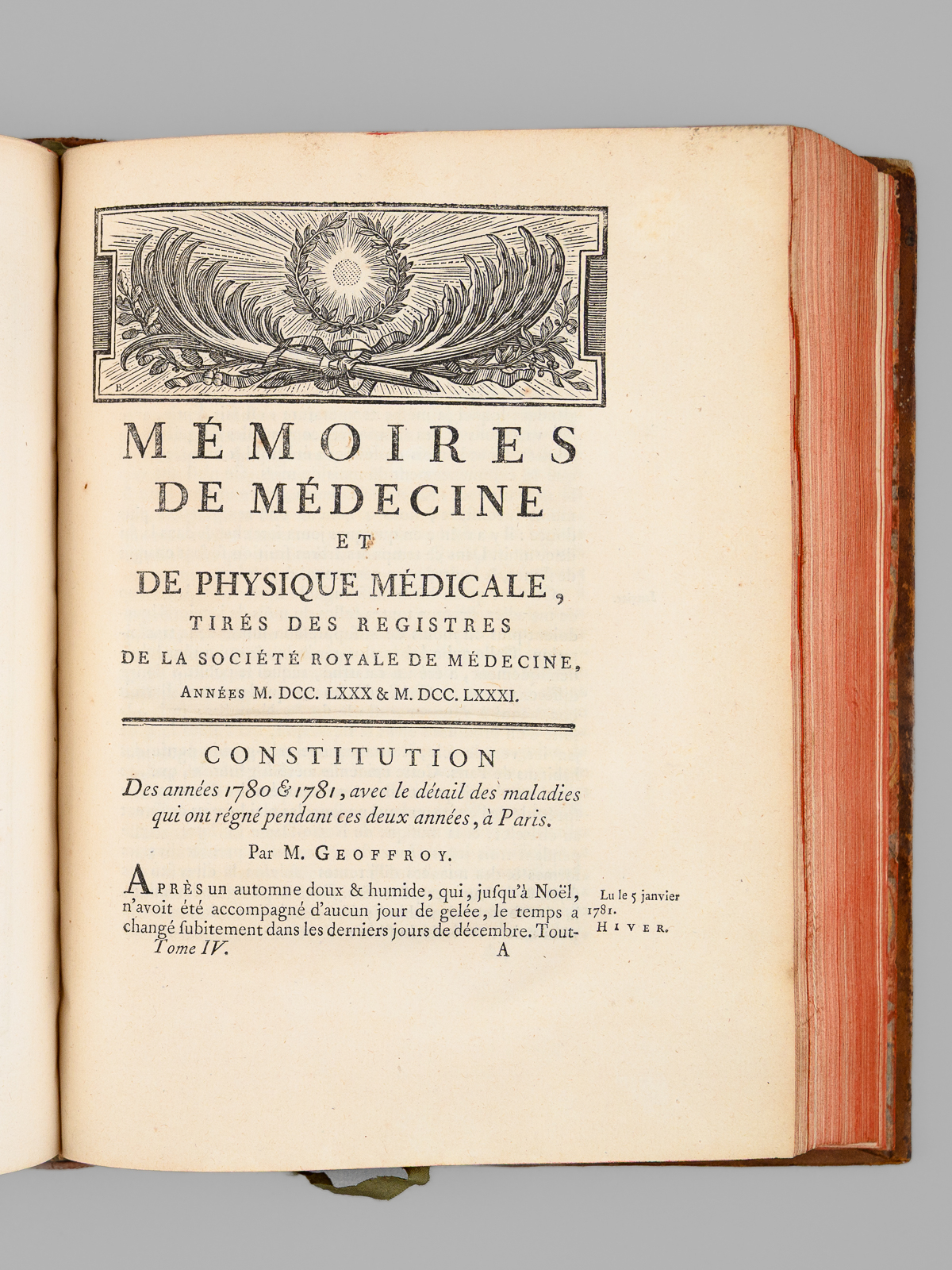 Commentaire : On trouve notamment un article du R.P. Cotte sur les 'Observations météorologiques' pour les années 170 & 1781, agrémentées d'impressionnantes 'Tables météorologiques' dépliantes, précisant notamment les relevés de thermomètre et de baromètre pour de nombreuses villes du Royaume mais aussi d'Angleterre et de Hollande, ainsi que des observations remarquables au verso. On y trouve également un très long mémoire 'sur les différentes manières d'administrer l'électricité, & Observations sur les effets que ces divers moyens ont produits', par l'électrothérapeute Mauduyt de La Varenne, et in fine un article de Lavoisier : 'Réflexions sur les effets de l'éther vitriolique & de l'éther nitreux dans l'économie animale'. Bon état (très petit mq. de cuir en mors, coupes et plats, très bon état par ailleurs).