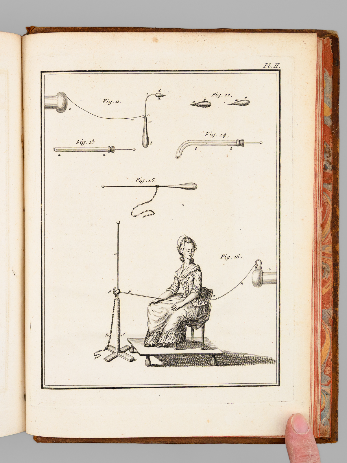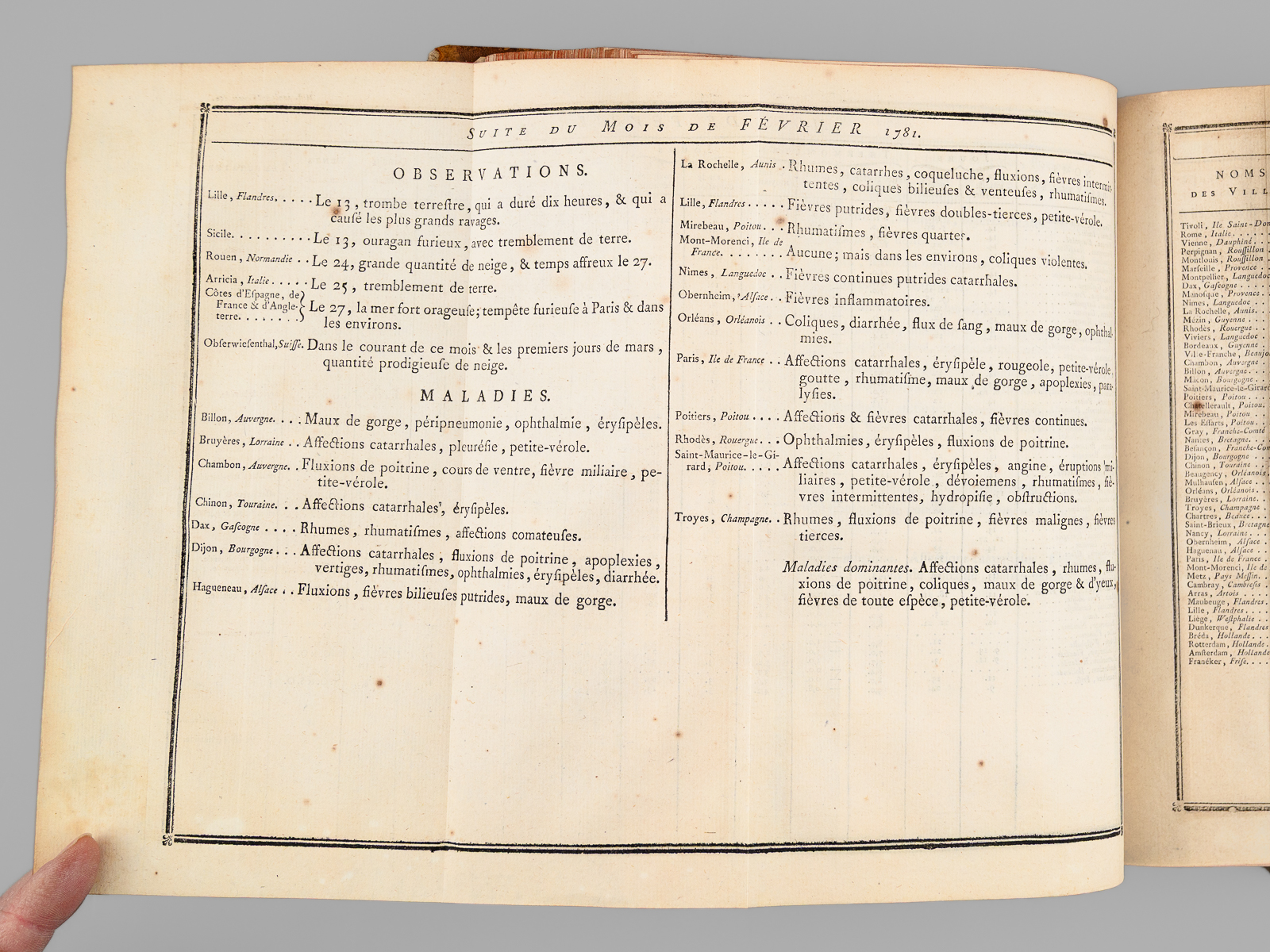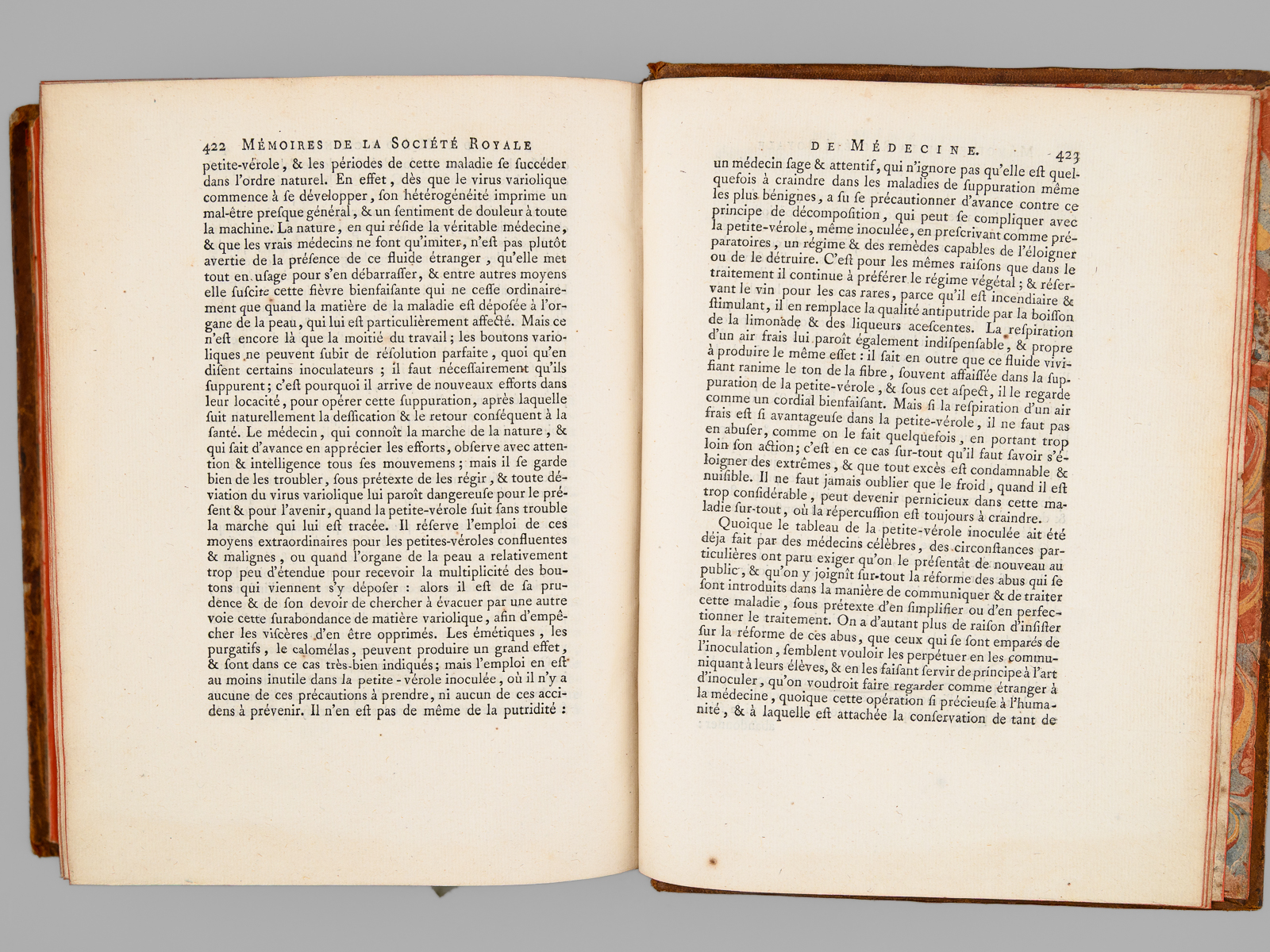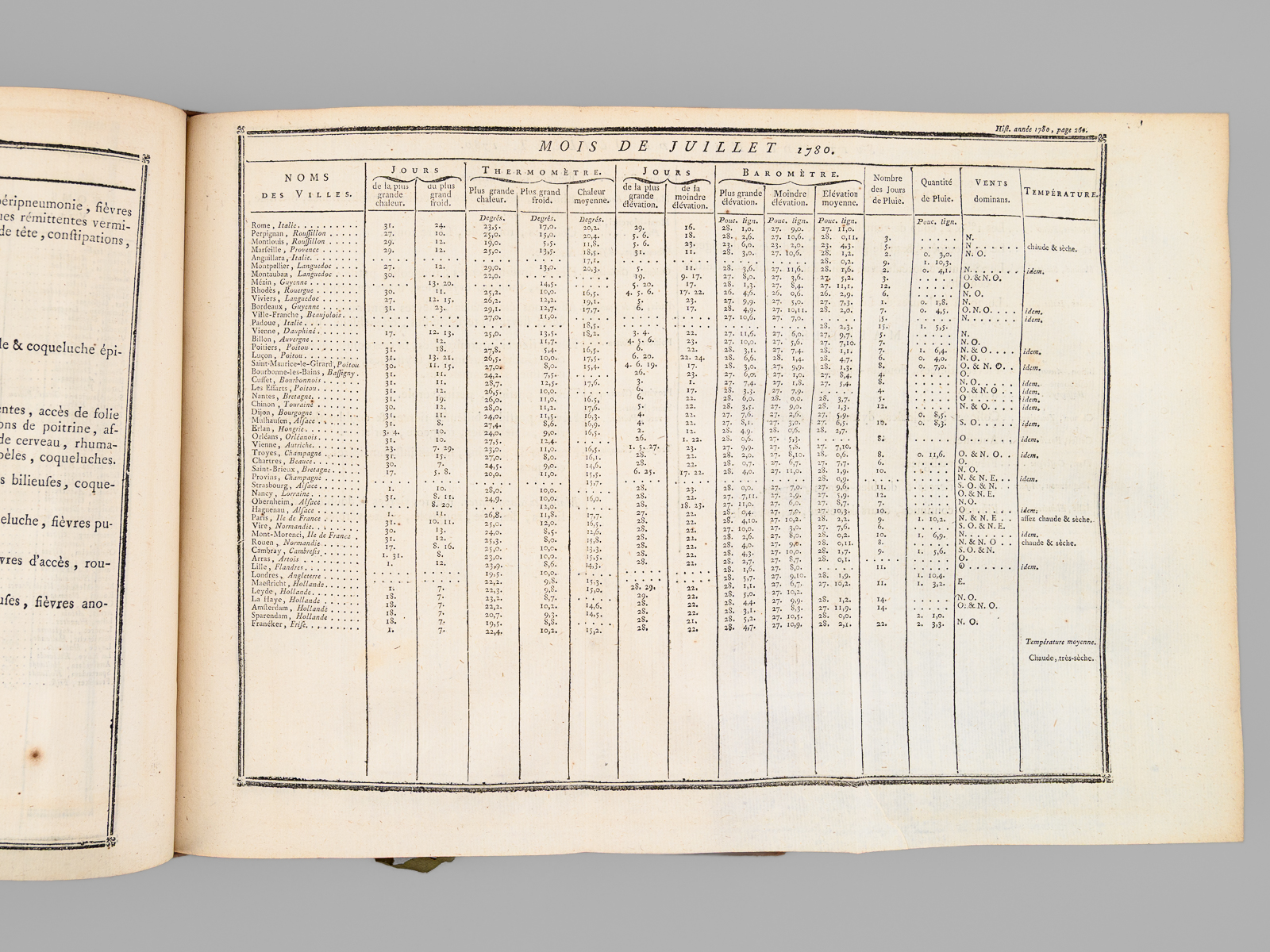 Commentaire : On trouve notamment un article du R.P. Cotte sur les 'Observations météorologiques' pour les années 170 & 1781, agrémentées d'impressionnantes 'Tables météorologiques' dépliantes, précisant notamment les relevés de thermomètre et de baromètre pour de nombreuses villes du Royaume mais aussi d'Angleterre et de Hollande, ainsi que des observations remarquables au verso. On y trouve également un très long mémoire 'sur les différentes manières d'administrer l'électricité, & Observations sur les effets que ces divers moyens ont produits', par l'électrothérapeute Mauduyt de La Varenne, et in fine un article de Lavoisier : 'Réflexions sur les effets de l'éther vitriolique & de l'éther nitreux dans l'économie animale'. Bon état (très petit mq. de cuir en mors, coupes et plats, très bon état par ailleurs).