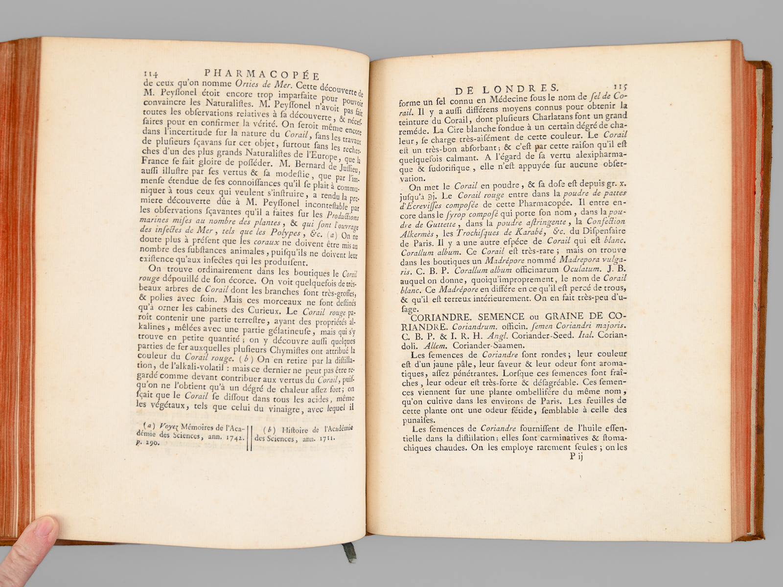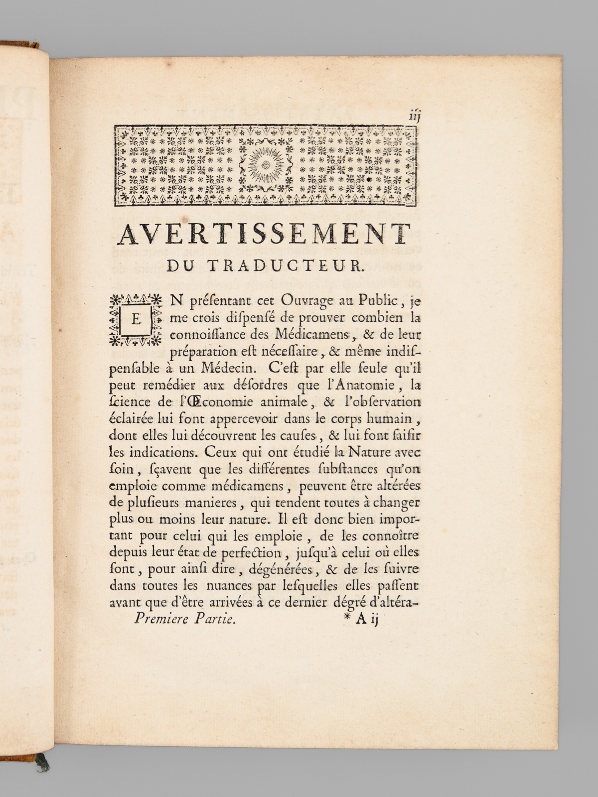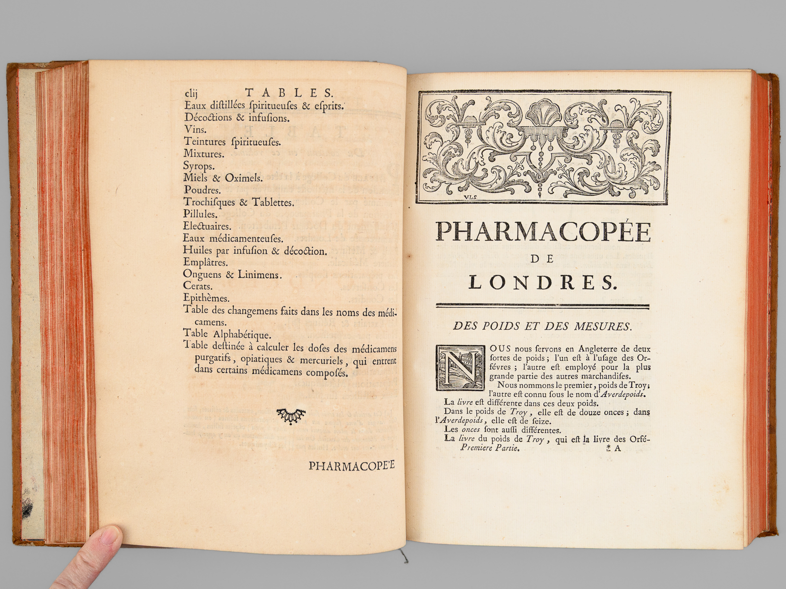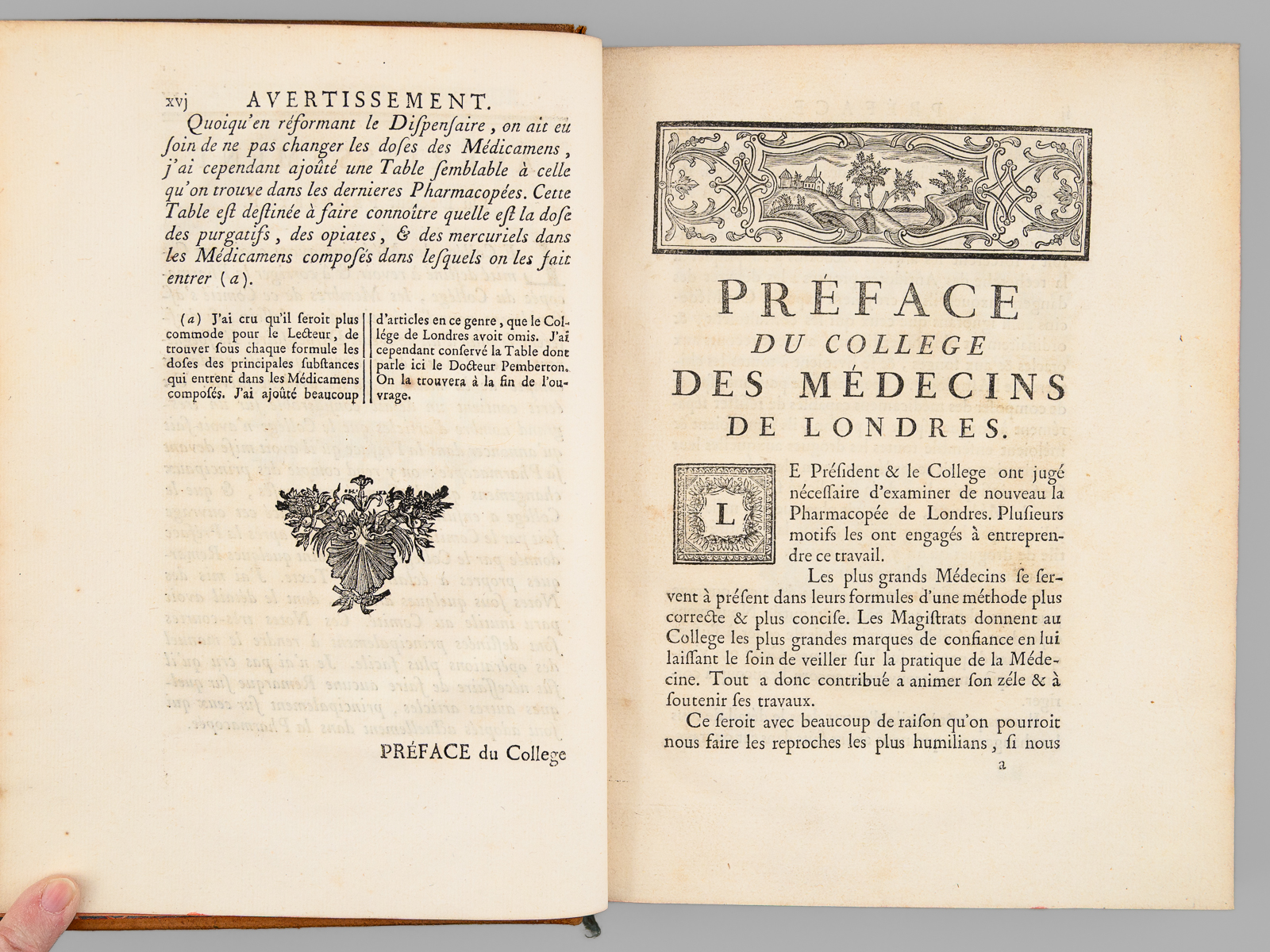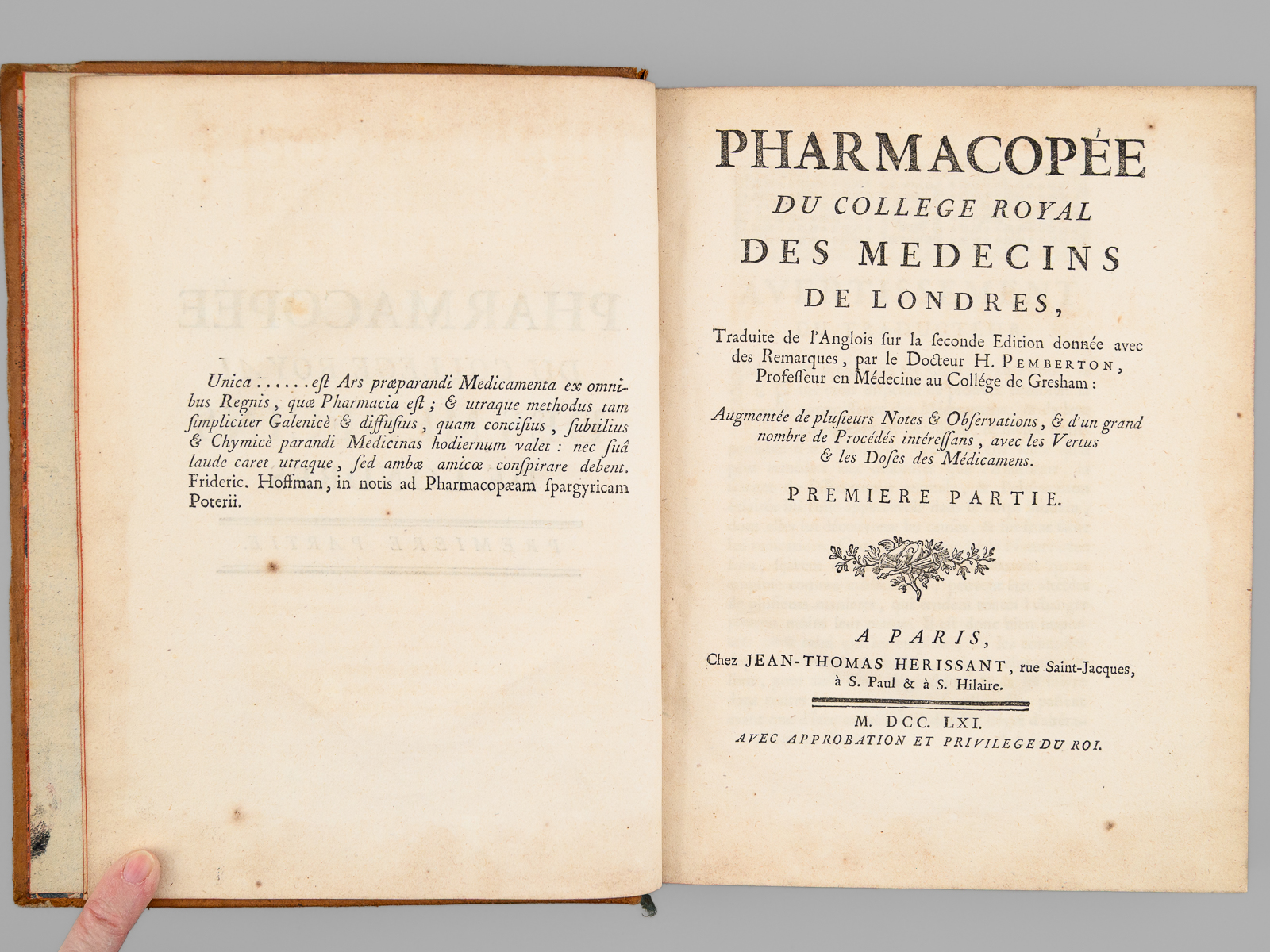 Traduit de l'Anglois sur la seconde Edition donnée avec des Remarques, par le Docteur H. Pemberton, Professeur en Médecine au Collège de Gresham, Augmentée de plusieurs Notes & Observations, & d'un nombre de Procédés intéressans, avec les Vertus & les Doses des Médicamens, 1 vol. in-4 reliure de l'époque pleine basane marbrée, pleine basane marbrée, dos à 5 nerfs orné, Chez Jean-Thomas Hérissant, Paris, 1761, 1 f., XVI-CLII-415 pp.