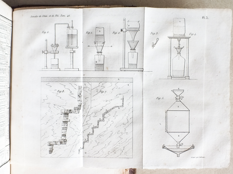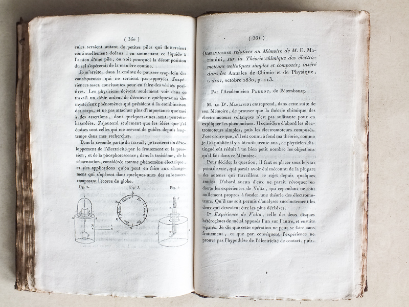 1 vol. in-8 cartonnage marbré de l'époque, Chez Crochard, Paris, 1831, 448 pp. avec 3 planches dépliantes. Contient notamment : Mémoire sur la Loi des modifications que la réflexion imprime à la lumière polarisée (Fresnel) ; Notice sur quelques phénomènes produits à la surface des fluides, en repos ou en mouvement, par la présence des corps solides qui y sont plus moins plongés (Poncelet) ; Nouvelle Théorie de l'action capillaire (Poisson) ; Rapport fait à l'Académie des Sciences, par M. Navier, sur un Mémoire de M. Raucourt relatif à la mesure des vitesses de la Néva ; Mémoire sur la maturation des fruits (Couverchel) ; Considérations générales sur les changemens qui s'opèrent dans l'état électrique des corps, par l'action de la chaleur, du contact, du frottement et de diverses actions chimiques, et sur les modifications qui en résultent quelquefois dans l'arrangement de leurs parties constituantes (Becquerel) ; Sur l'acide lactique (Berzelius), etc... Commentaire : Rare exemplaire du tome 46 des 'Annales de Chimie et de Physique' contenant notamment le Mémoire de Fresnel retrouvé dans les papiers de Fourier. Etat moyen (accroc avec manque important au dos en queue)