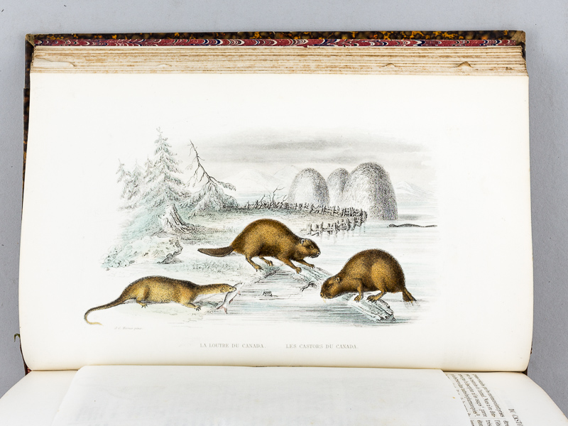 6 vol. in-4 reliure demi-basane verte, Chez Furne et Cie, Paris, 1853-1858, Tome I : Matières générales. Théorie de la Terre, 782 pp. avec portrait et 5 cartes hors texte ; Tome II : Matières Générales, II Théorie de la terre. Minéraux, 775 pp. ; Tome III : Mammifères, 726 pp. avec 18 pl. hors texte ; Tome IV : Mammifères, 784 pp. avec 31 planches hors texte ; Tome V : Les Oiseaux, 653 pp. avec 44 planches hors texte ; Tome VI : Les Oiseaux, 732 pp. avec 30 planches hors texte Commentaire : Série bien complète des planches, avec 128 planches en couleurs sur les 127 indiquées dans l'avis au relieur (avec une planche supplémentaire dans le tome 3 : 'Le lapin'). Etat satisfaisant(reliures fort. frottées avec manques en coiffes, qq. ressauts de cahiers, rouss.). Les 128 planches couleurs, dessinées par Edouard Traviès et Janet-Lange, sont souvent très belles. Prix en l'état pour cet ensemble très intéressant.