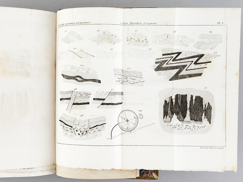 Nouvelle édition, revue et corrigée, 3 tomes en 2 vol. in-8 reliure de l'époque demi-veau brun, dos lisse orné, Vol I : Traité de Géognosie, Chez F. G. Levrault, Paris, 1828, XLVIII-524 pp. avec une planche dépliante en couleurs et Cours élémentaire de Géologie, minéralogie et géognosie, Aimé André, Paris, 1843, 2 ff., XII-480 pp. avec 6 planches dépliantes ; Vol. II : Traité de Géognosie, Tome Second, Chez F. G. Levrault Paris, 1834, VI-649 pp. avec 8 pl. dépliantes Commentaire : Ce bel et curieux exemplaire réuni les deux premiers tomes (sur 3) de la seconde édition du 'Traité de Géognosie' et le 'Cours élémentaire de Géologie, minéralogie et géognosie' de Barruel, qui est peu commun.