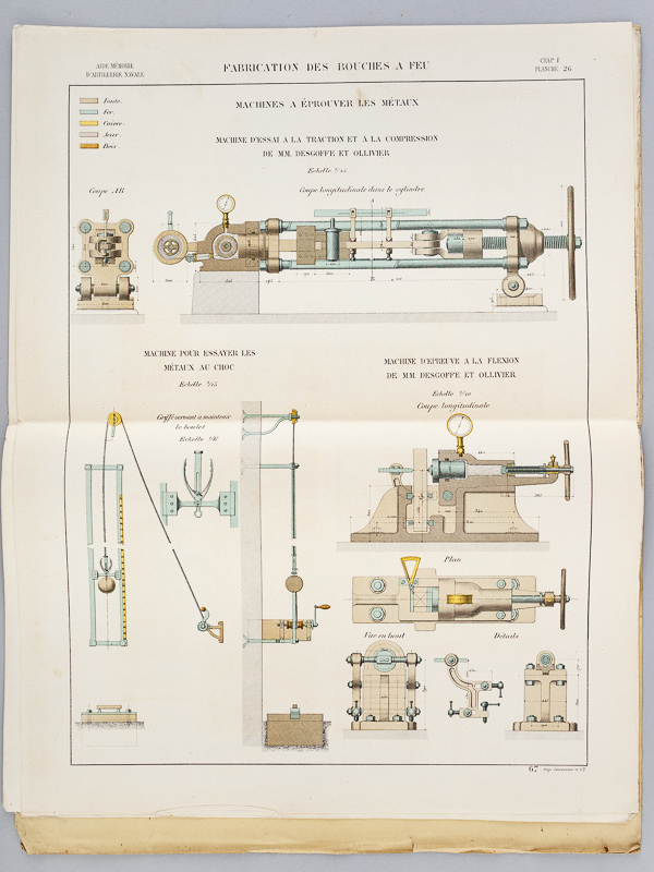 18 planches dont 9 chromolithographiées au format 72 x 36 cm, sous chemise d'origine, Aide-Mémoire d'Artillerie Navale. Planches. 2e Livraison 1875 (Annexe au Mémorial de l'artillerie de la marine), Imp. Lemercier et Cie, Typographie Georges Chamerot : Planche 23 : Atelier des fours à réverbères ; Planches 24 et 25 : Fours à réverbère de la contenance de 7500 kg ; Pl. 26 : Machine d'essai à la traction et à la compression de Desgoffe et Ollivier ; 27 : Machine à éprouver les métaux à la traction du colonel Maillard ; 28 : Balance Joessel ; 29 : Banc de forage ; 30 : Outils divers ; 31 : Atelier de tubage ; 32 : Frettage. Installation de la pièce à fretter ; 33 : Machine à rayer les canons ; 34 : Machine à tarauder les culasses ; 35 : Machine à percer horizontale ; 36 : Presse pour la mise en place des grains de lumière. Appareil à réaléser les logements d'obturateur des canons ; 37 : Hauts-fourneaux de Ruelle ; 38 : Etuve pour les Moules des Canons ; 39 : Machine à fraiser la glissière du verrou des appareils de mise de feu 40 : Instruments de mesure Commentaire : Deuxième livraison de 1875 bien complète de l'intégralité toutes ses planches (la 38 et 39, publiées seulement jointes dans la livraison suivante sont icic bien présentes). Bon état (accroc à la chemise, bon état par ailleurs)