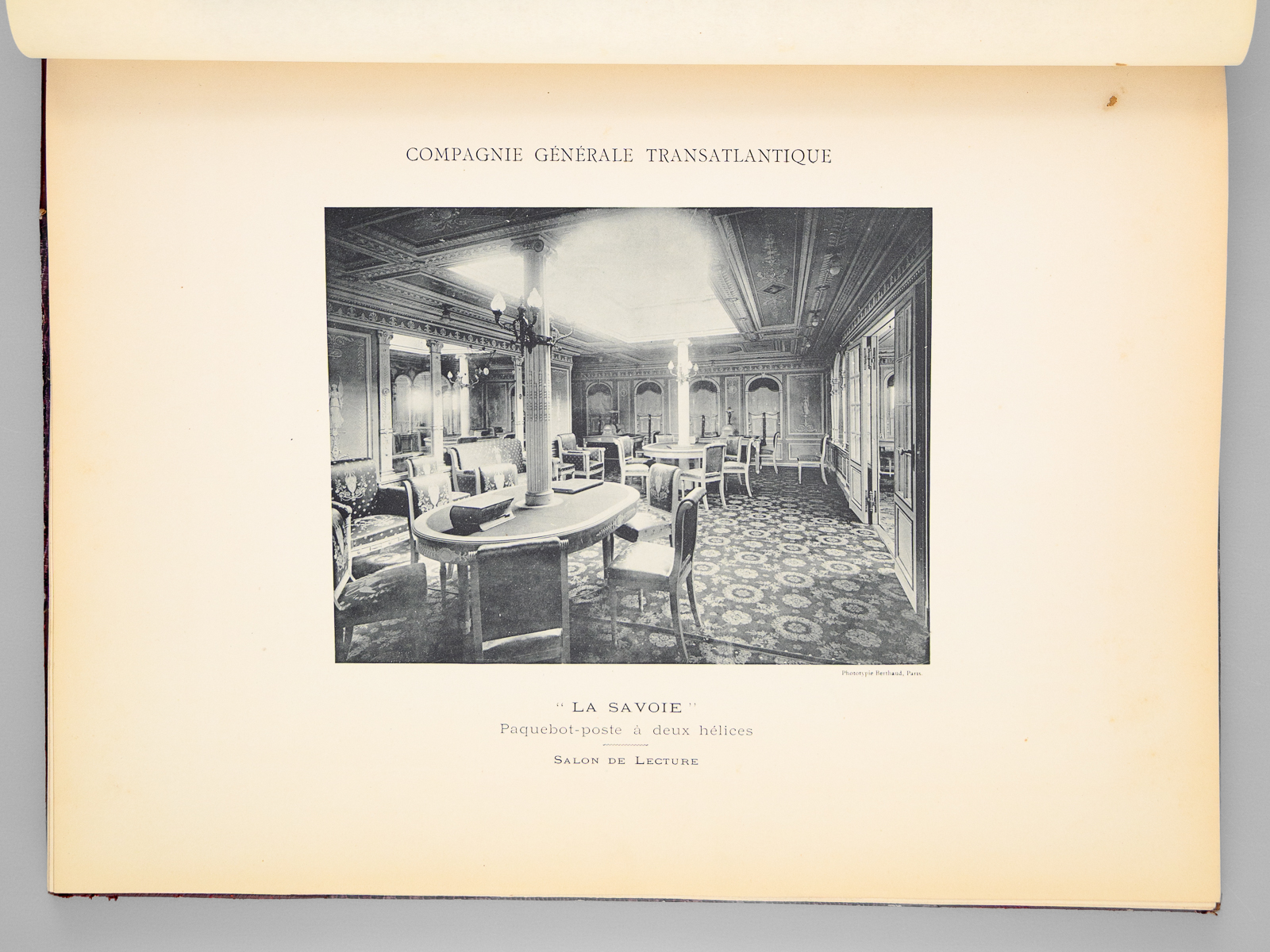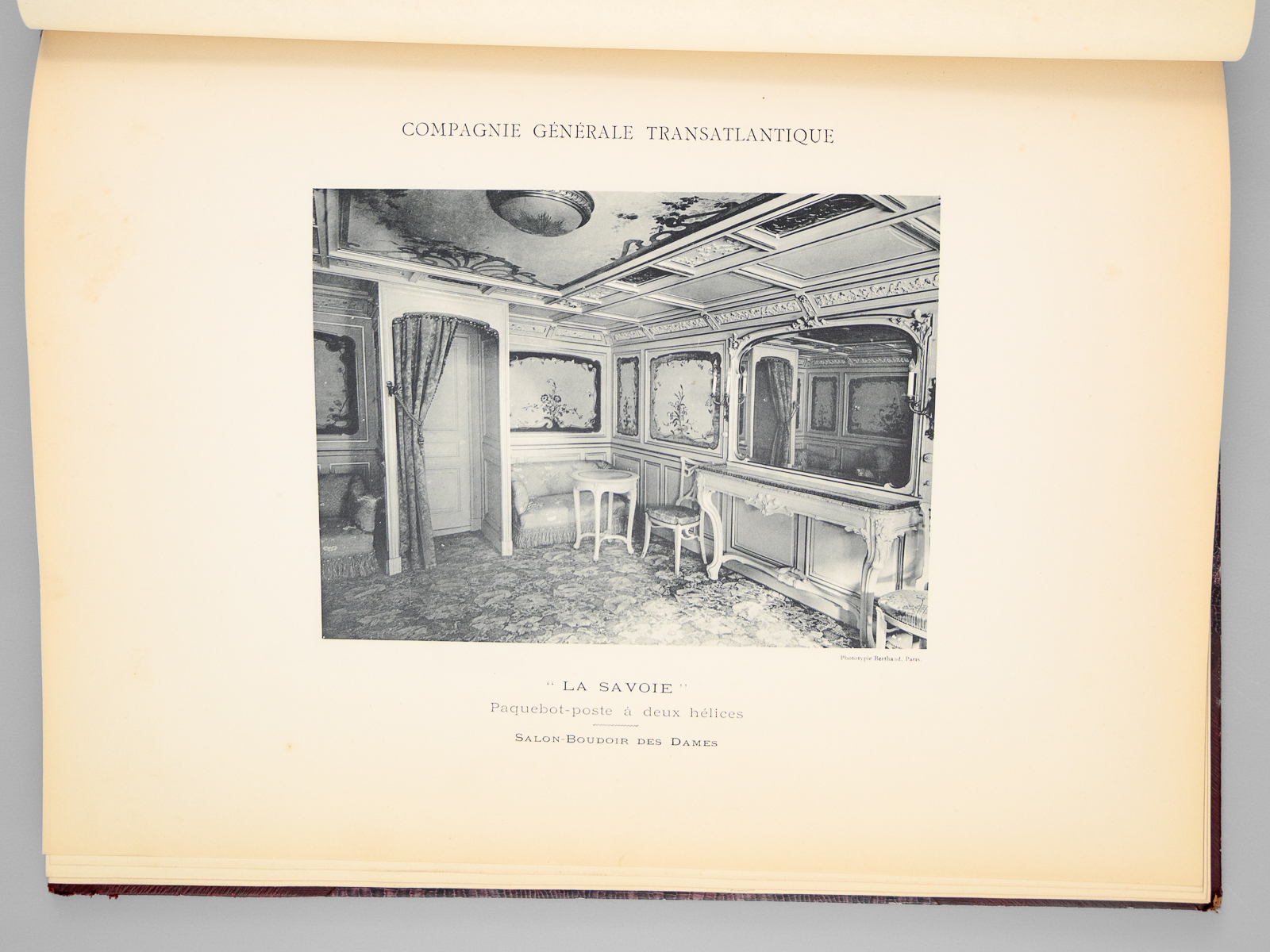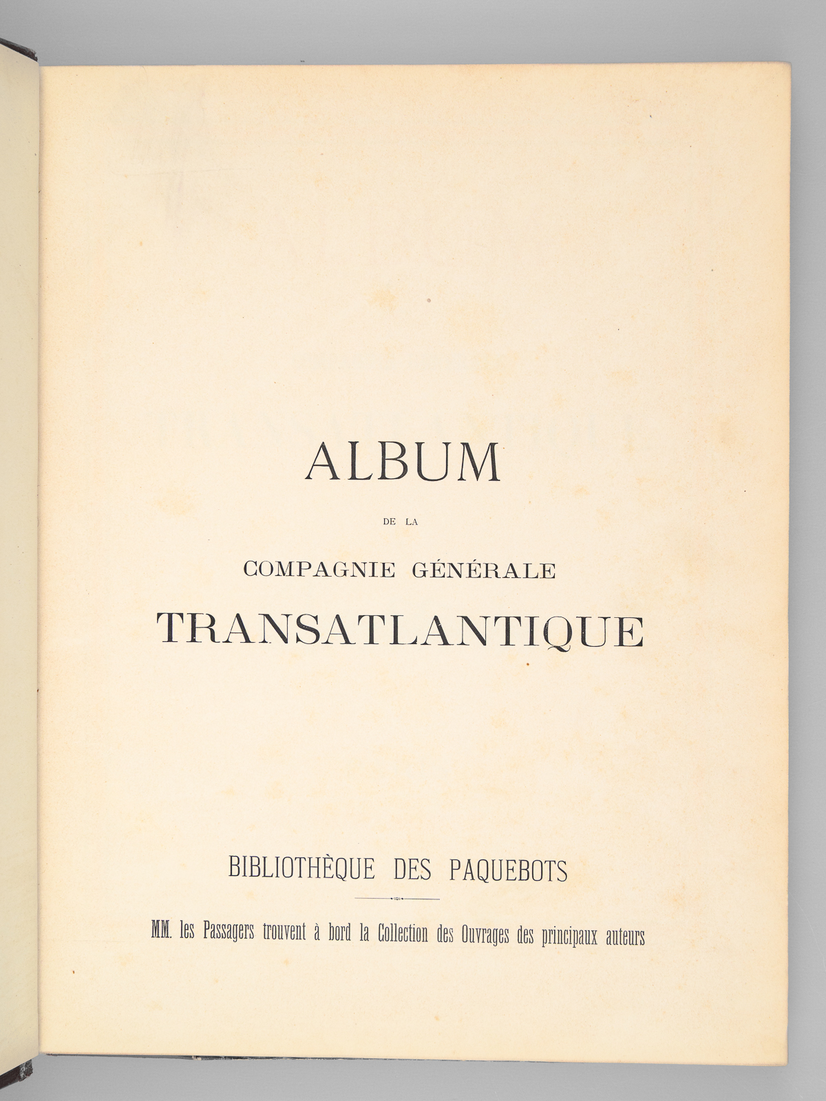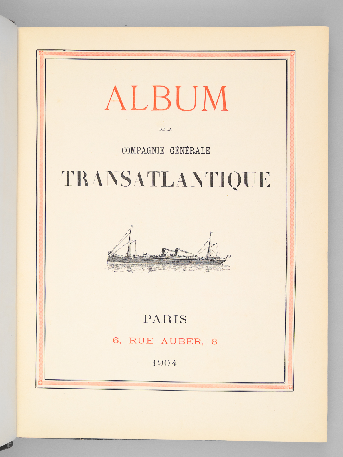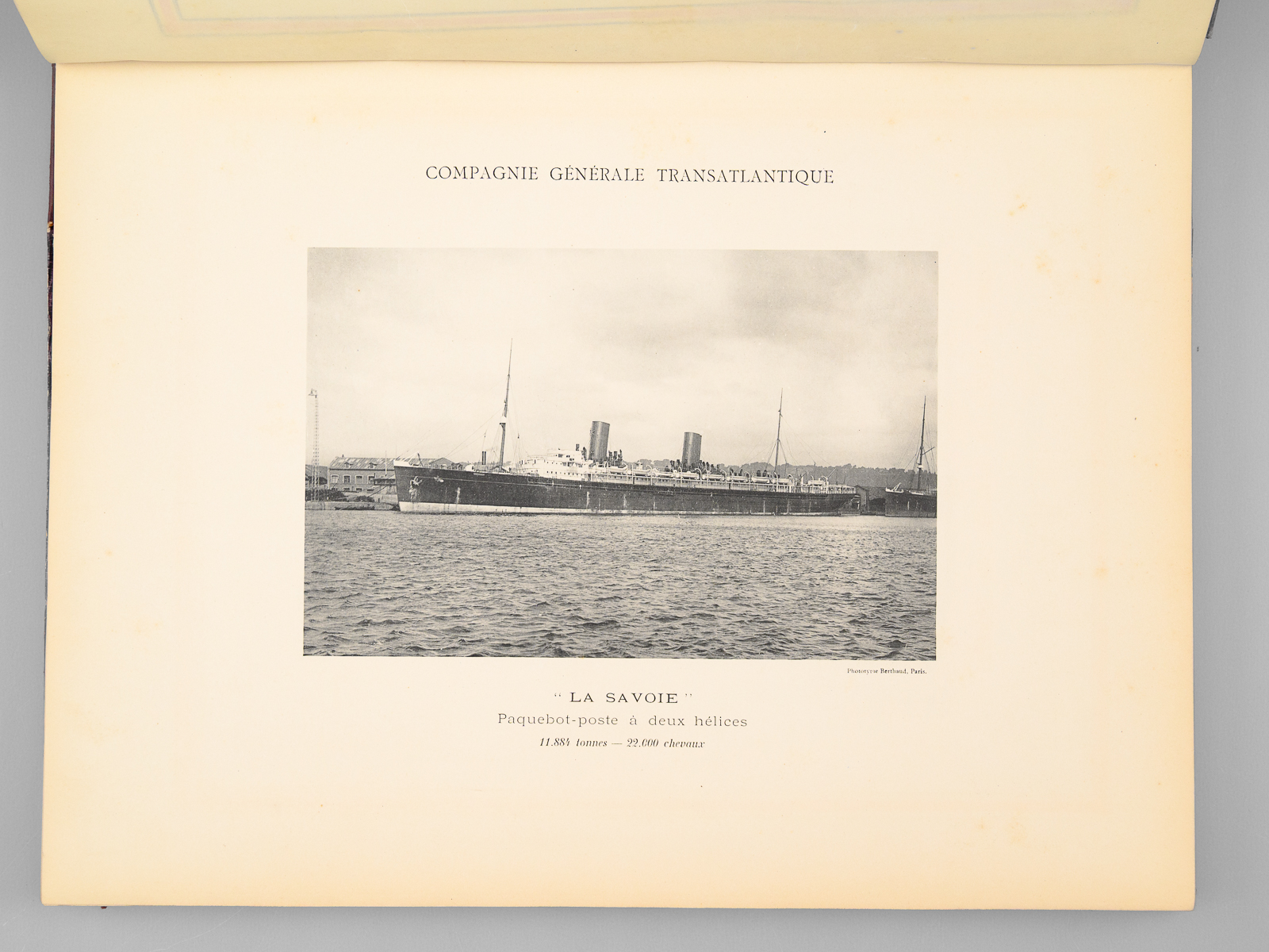 1 vol. in-folio reliure de l'époque demi-cuir maroquiné bordeaux, double filet doré en mors et coins, s.n., Imprimerie Maréchal et Montorier, A. Maréchal Succr., Paris, 1904 Commentaire : Très bel album proposant notamment le détail de la flotte de la Compagnie Générale Transatlantique (jauge brute de 173.409 tonnes), de nombreuses vues de 'La Savoie', pauebot-poste à deux hélices de 11.884 tonnes, le détail des services postaux mais des différents voyages proposés par la CGT (voyages circulaires, excursions aux oasis du Sahara), de très belles publicités (Compagnes des Forges et aciéries de la marine & des chemins de fer, Th. Botiaux & Cie, Ingénieurs-Constructeurs, etc...), de nombreux extraits de journaux et revues illustrées, etc.... Bon état (reliure un peu frottée avec usures en coiffes, bon exemplaire par ailleurs)