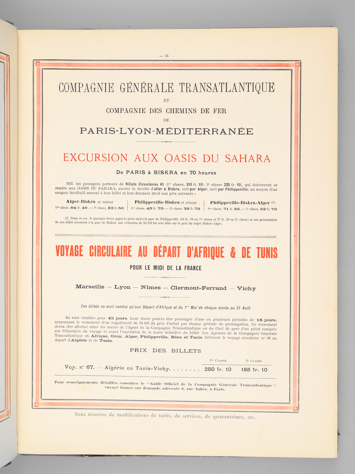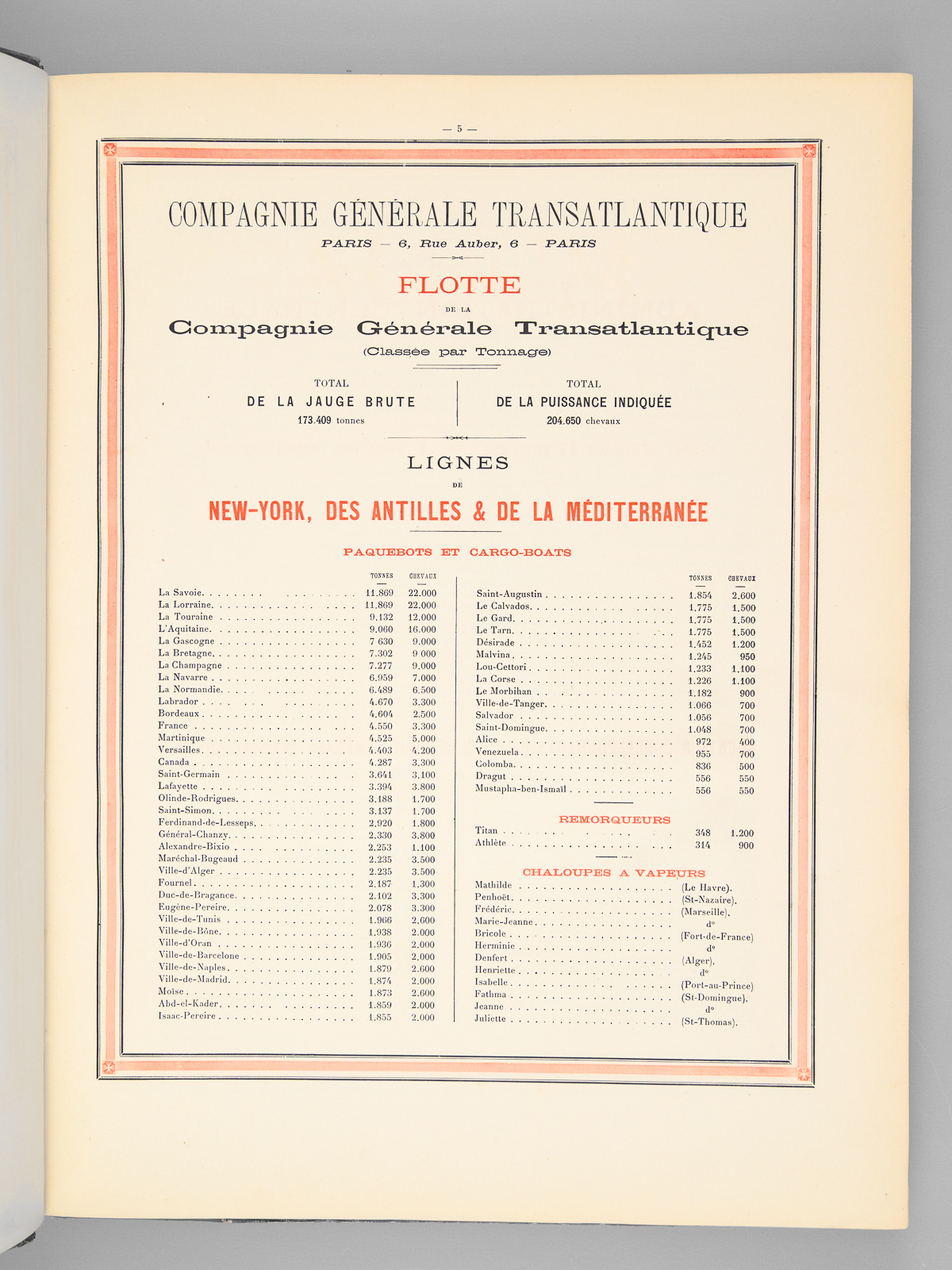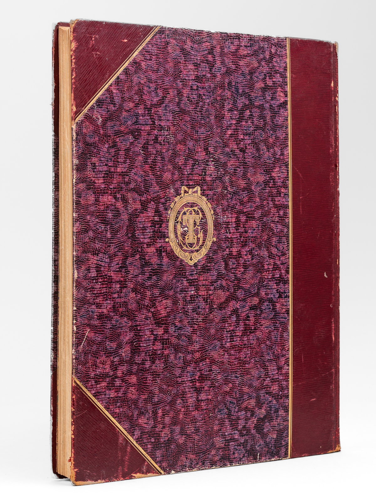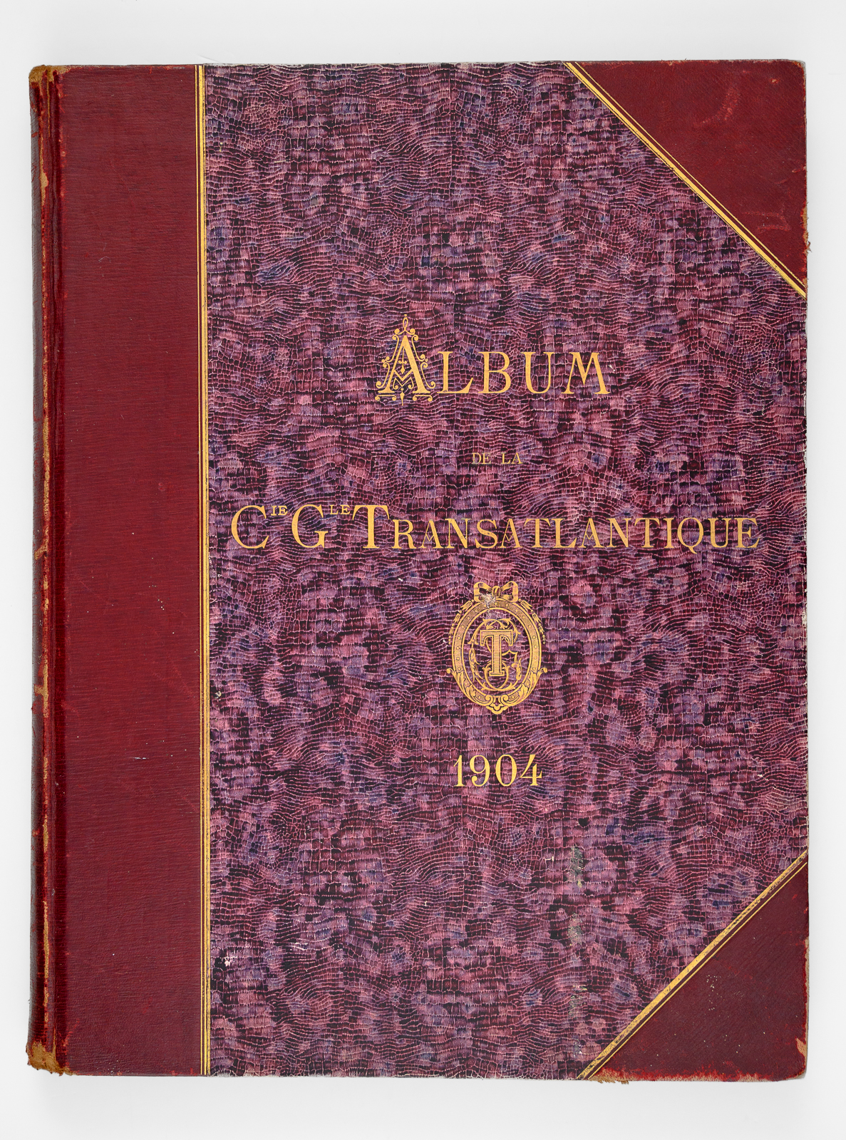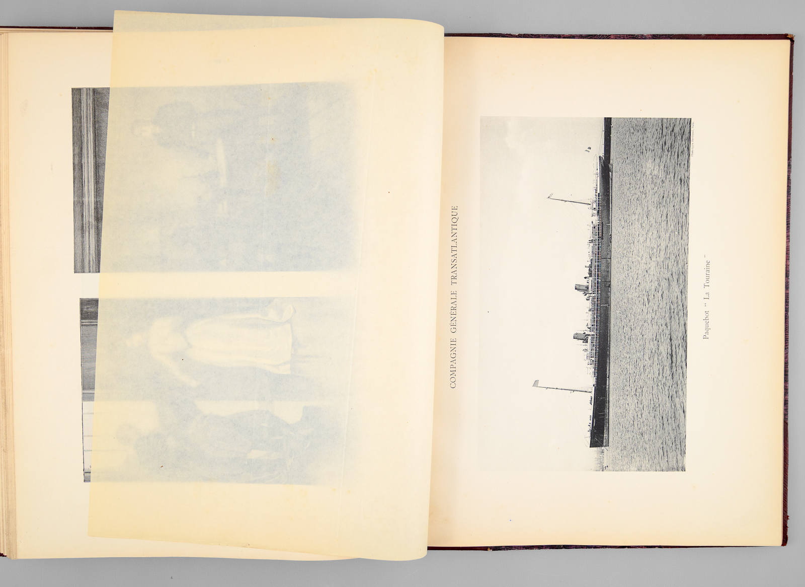 1 vol. in-folio reliure de l'époque demi-cuir maroquiné bordeaux, double filet doré en mors et coins, s.n., Imprimerie Maréchal et Montorier, A. Maréchal Succr., Paris, 1904 Commentaire : Très bel album proposant notamment le détail de la flotte de la Compagnie Générale Transatlantique (jauge brute de 173.409 tonnes), de nombreuses vues de 'La Savoie', pauebot-poste à deux hélices de 11.884 tonnes, le détail des services postaux mais des différents voyages proposés par la CGT (voyages circulaires, excursions aux oasis du Sahara), de très belles publicités (Compagnes des Forges et aciéries de la marine & des chemins de fer, Th. Botiaux & Cie, Ingénieurs-Constructeurs, etc...), de nombreux extraits de journaux et revues illustrées, etc.... Bon état (reliure un peu frottée avec usures en coiffes, bon exemplaire par ailleurs)