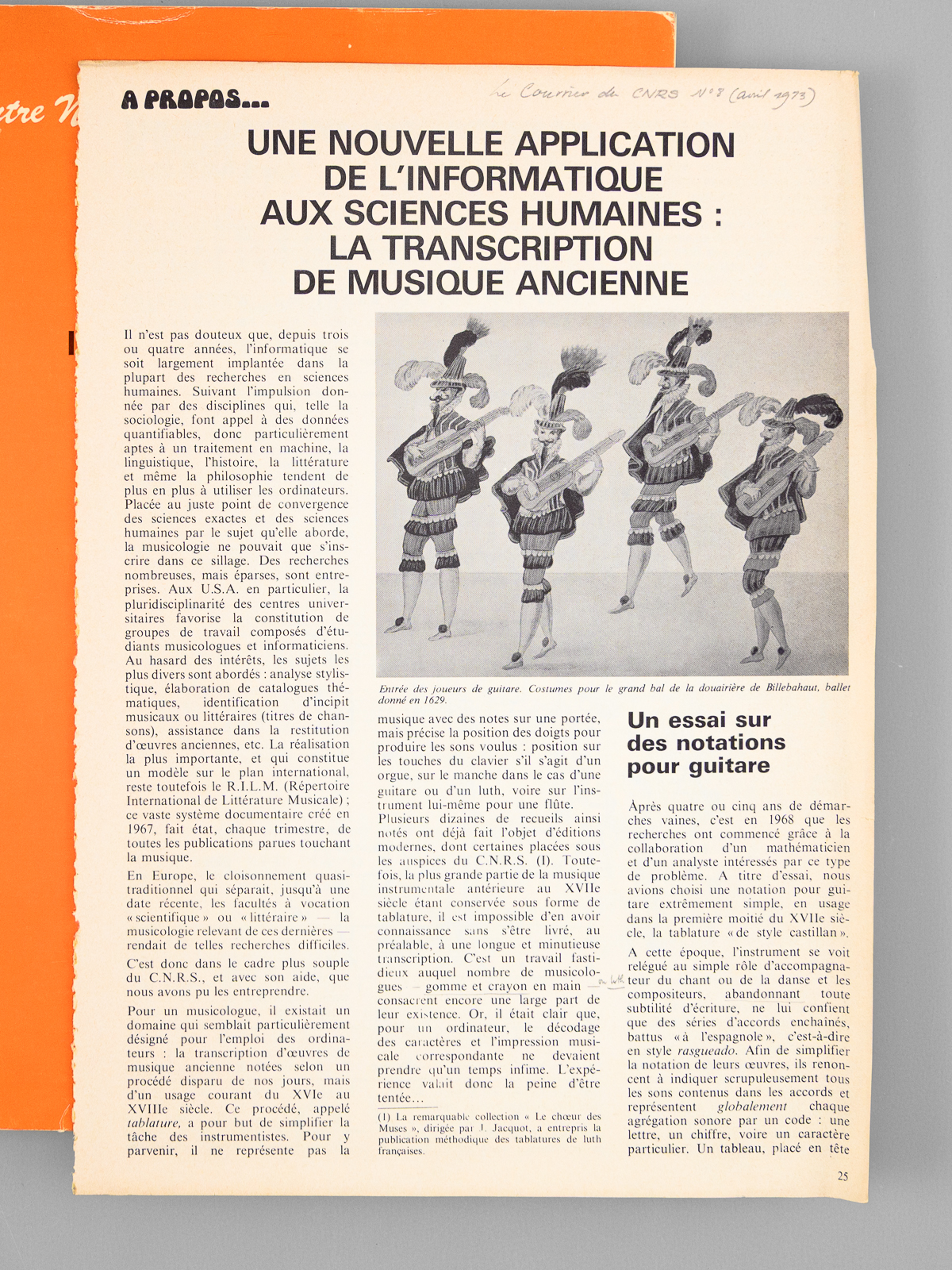 Informatique musicale - Journées d'étude 1973 , texte des conférences E.R.A.T.T.O. [ Equipe de Recherche sur l'Analyse et la Transcription des Tablatures par ordinateurs ]