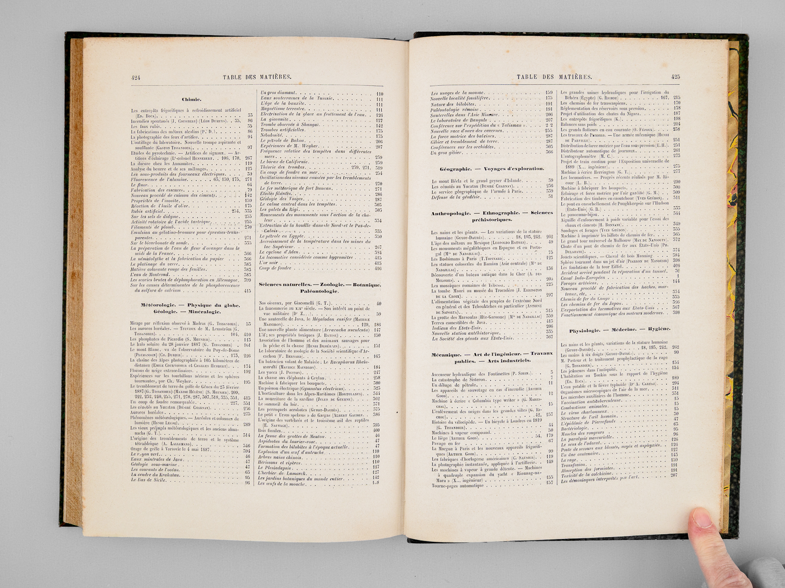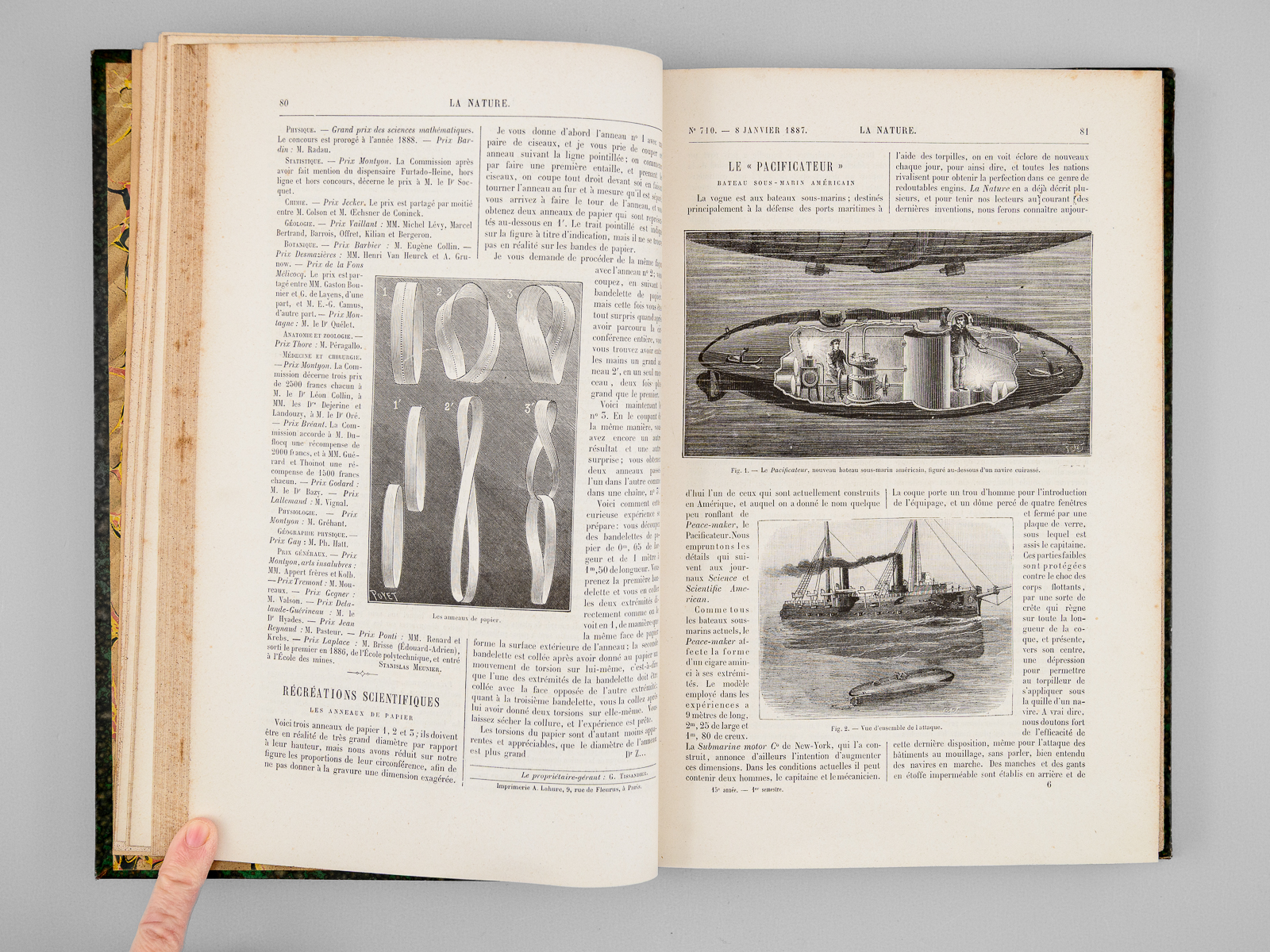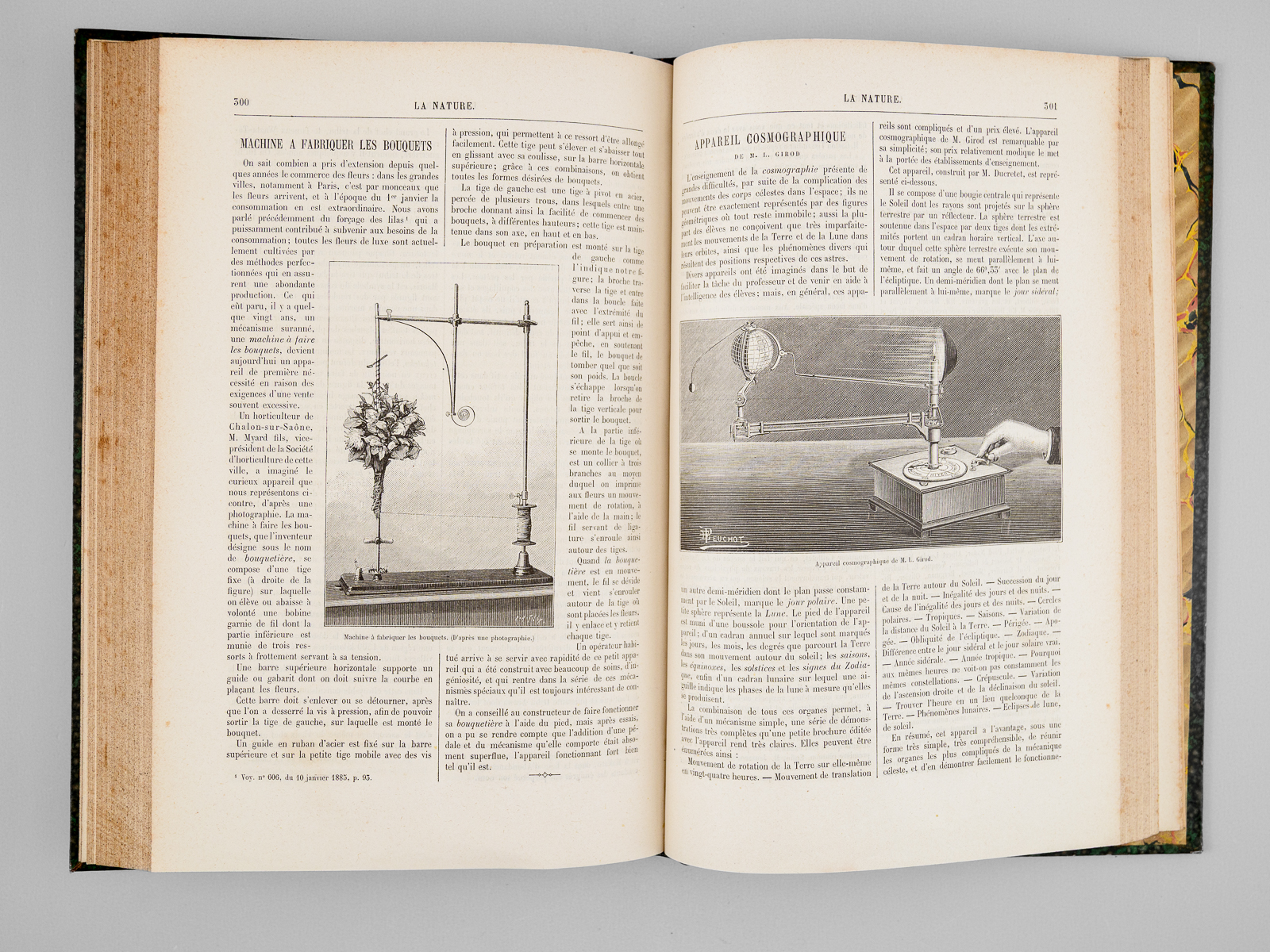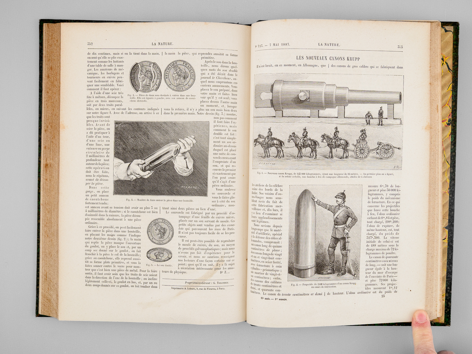 2 vol. in-4 rel. demi-chagrin vert, dos à 4 nerfs, G. Masson éditeur, Paris, 1887, 427 pp. et 427 pp. Au Sommaire notamment : Les locomotives. Progrès récents réalisés par M. Ricour ; Les diamants de la Couronne ; L'âge des métaux au Mexique ; Le laboratoire de zoologie de la société scientifique d'Arcachon ; L'origine des Vertébrés et le troisième oeil des Reptiles ; Pêches et pêcheries de l'Annam. La pêche au dauphin ; Le calendrier perpétuel et la mnémonique ; Les entrepôts frigorifiques à refroidissement artificiel ; L'habitation au Tonkin sous le rapport de l'hygiène ; Aiguille d'enfoncement à poids variable pour l'essai des chaux et ciments ; L'if, ses propriétés toxiques ; L'autographomètre ; La science au théâtre. Sur un appareil permettant de transmettre la mesure à des exécutants placés de manière à ne point voir le chef d'orchestre ; L'eau potable et la fièvre typhoïde ; Les cénotés du Yucatan ; La chaîne des Alpes photographiée à 103 kilomètres de distance ; Association de l'homme et des animaux sauvages pour la pêche et la chasse ; Bec à incandescence du Dr Auer von Welsbach ; Chute d'un pont de chemin de fer aux États-Unis ; Le Mont Blanc vu de l'observatoire du Puy-de-Dôme ; La tombe Maori au Musée du Trocadéro ; Les grands flotteurs en eau courante ; L'éclairage électrique à l'Opéra de Paris ; Les faux rubis ; Le petit « Ursus spelaeus » de Gargas ; Les appareils de sauvetage en cas d'incendie ; Le liège ; La Morgue à Paris, et les nouveaux appareils frigorifiques ; Fabrication des timbres en caoutchouc ; Sondages et forages ; La nourriture de la sardine ; Les nains et les géants. Les variations de la stature humaine ; Les mains à six doigts ; Les perroquets acrobates Le tremblement de terre du 23 février 1887, dans le golfe de Gênes (notes d'un témoin) ; La constante de l'aberration ; Les récents paquebots transatlantiques ; Torpilles balistiques ; Études de pyrotechnie, artifices de signaux, artifices d'éclairage, les fabriques pyrotechniques au XVIIe siècle ; Les nouveaux canons Krupp ; Conseils aux amateurs de jardinage : Les jardins de fenêtre ; L'horticulture dans les Alpes-Maritimes ; Les machines dynamo-électriques à distribution ; Expériences de M. Hippolyte Fontaine ; La soudure électrique ; Distribution de force motrice par l'eau sous pression ; L'École d'arboriculture et de viticulture de Geisenheim ; Wagons américains pour le transport des poissons ; L'origine des tremblements de terre et le système tétraédrique ; La photographie instantanée d'un torpilleur à grande vitesse
