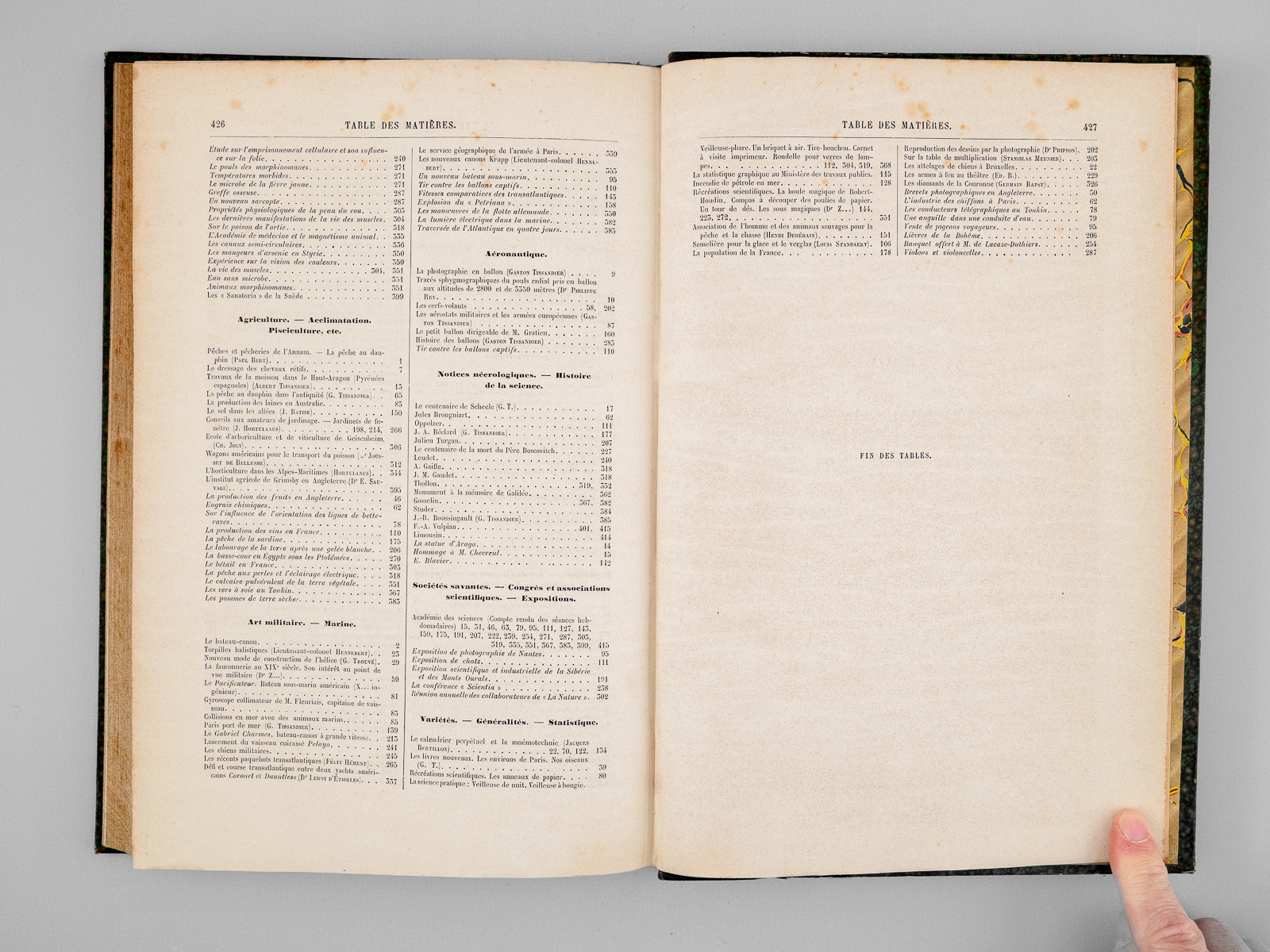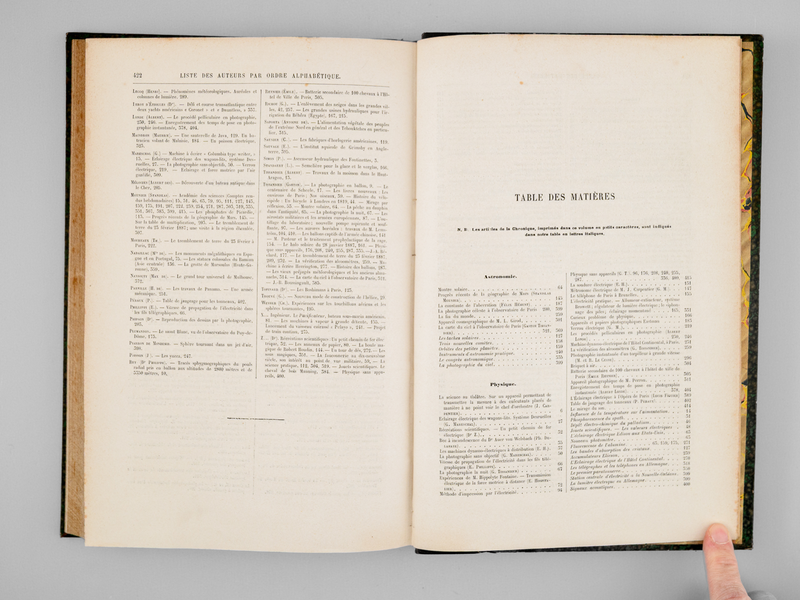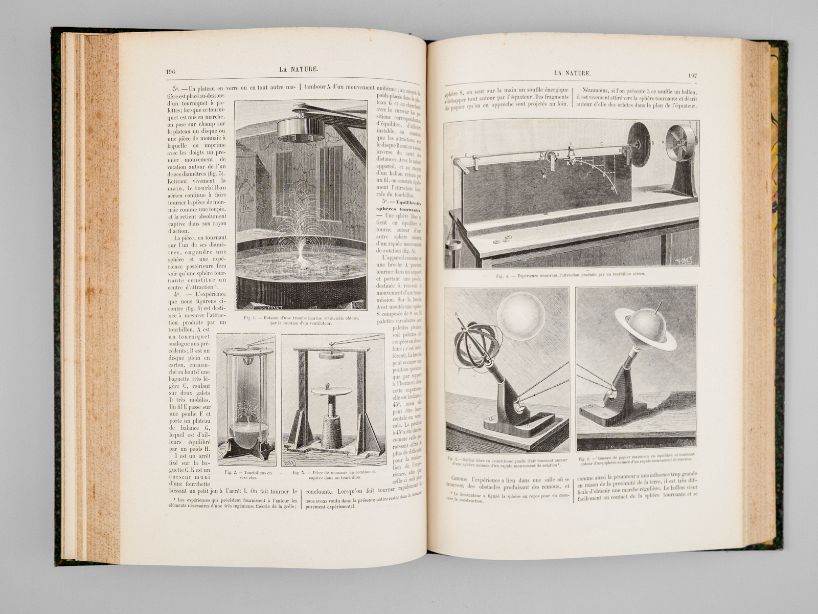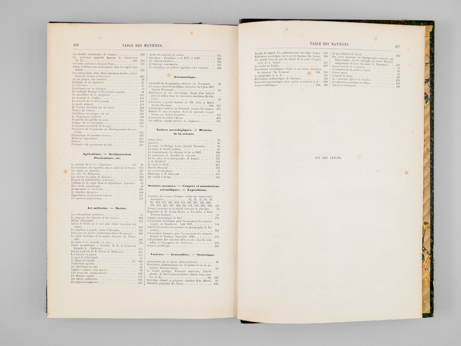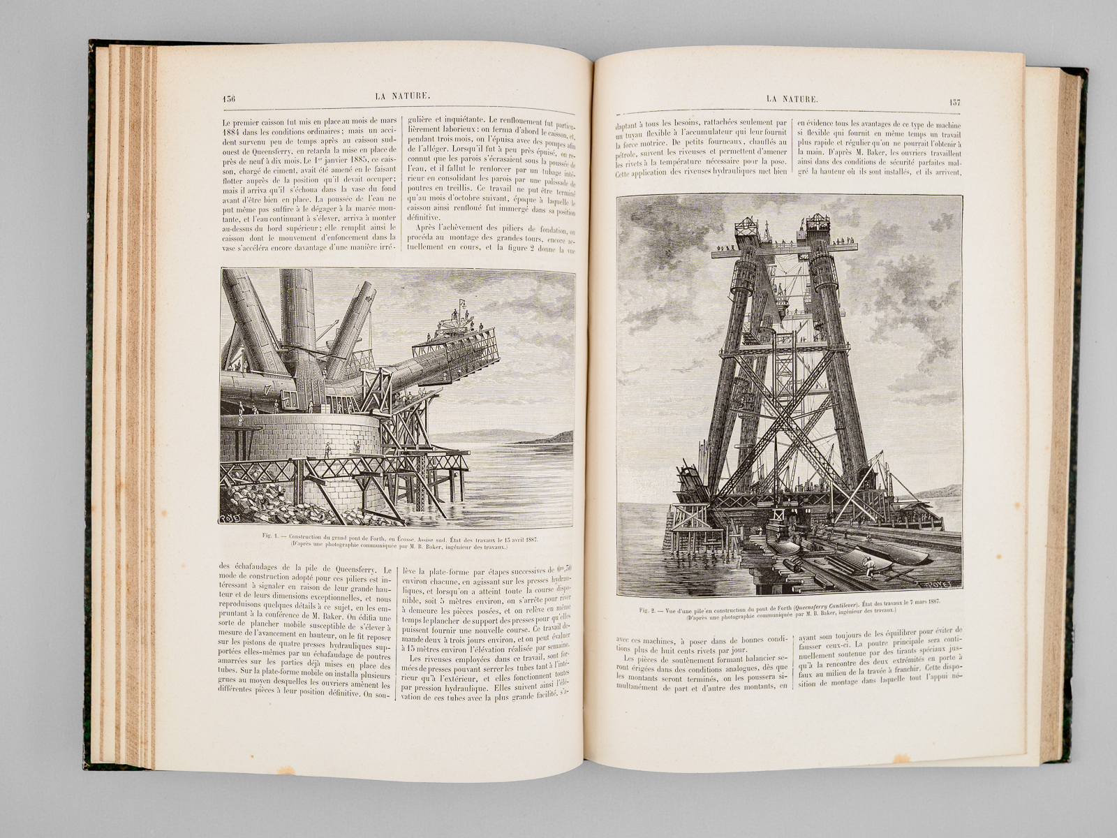 2 vol. in-4 rel. demi-chagrin vert, dos à 4 nerfs, G. Masson éditeur, Paris, 1887, 427 pp. et 427 pp. Au Sommaire notamment : Les locomotives. Progrès récents réalisés par M. Ricour ; Les diamants de la Couronne ; L'âge des métaux au Mexique ; Le laboratoire de zoologie de la société scientifique d'Arcachon ; L'origine des Vertébrés et le troisième oeil des Reptiles ; Pêches et pêcheries de l'Annam. La pêche au dauphin ; Le calendrier perpétuel et la mnémonique ; Les entrepôts frigorifiques à refroidissement artificiel ; L'habitation au Tonkin sous le rapport de l'hygiène ; Aiguille d'enfoncement à poids variable pour l'essai des chaux et ciments ; L'if, ses propriétés toxiques ; L'autographomètre ; La science au théâtre. Sur un appareil permettant de transmettre la mesure à des exécutants placés de manière à ne point voir le chef d'orchestre ; L'eau potable et la fièvre typhoïde ; Les cénotés du Yucatan ; La chaîne des Alpes photographiée à 103 kilomètres de distance ; Association de l'homme et des animaux sauvages pour la pêche et la chasse ; Bec à incandescence du Dr Auer von Welsbach ; Chute d'un pont de chemin de fer aux États-Unis ; Le Mont Blanc vu de l'observatoire du Puy-de-Dôme ; La tombe Maori au Musée du Trocadéro ; Les grands flotteurs en eau courante ; L'éclairage électrique à l'Opéra de Paris ; Les faux rubis ; Le petit « Ursus spelaeus » de Gargas ; Les appareils de sauvetage en cas d'incendie ; Le liège ; La Morgue à Paris, et les nouveaux appareils frigorifiques ; Fabrication des timbres en caoutchouc ; Sondages et forages ; La nourriture de la sardine ; Les nains et les géants. Les variations de la stature humaine ; Les mains à six doigts ; Les perroquets acrobates Le tremblement de terre du 23 février 1887, dans le golfe de Gênes (notes d'un témoin) ; La constante de l'aberration ; Les récents paquebots transatlantiques ; Torpilles balistiques ; Études de pyrotechnie, artifices de signaux, artifices d'éclairage, les fabriques pyrotechniques au XVIIe siècle ; Les nouveaux canons Krupp ; Conseils aux amateurs de jardinage : Les jardins de fenêtre ; L'horticulture dans les Alpes-Maritimes ; Les machines dynamo-électriques à distribution ; Expériences de M. Hippolyte Fontaine ; La soudure électrique ; Distribution de force motrice par l'eau sous pression ; L'École d'arboriculture et de viticulture de Geisenheim ; Wagons américains pour le transport des poissons ; L'origine des tremblements de terre et le système tétraédrique ; La photographie instantanée d'un torpilleur à grande vitesse