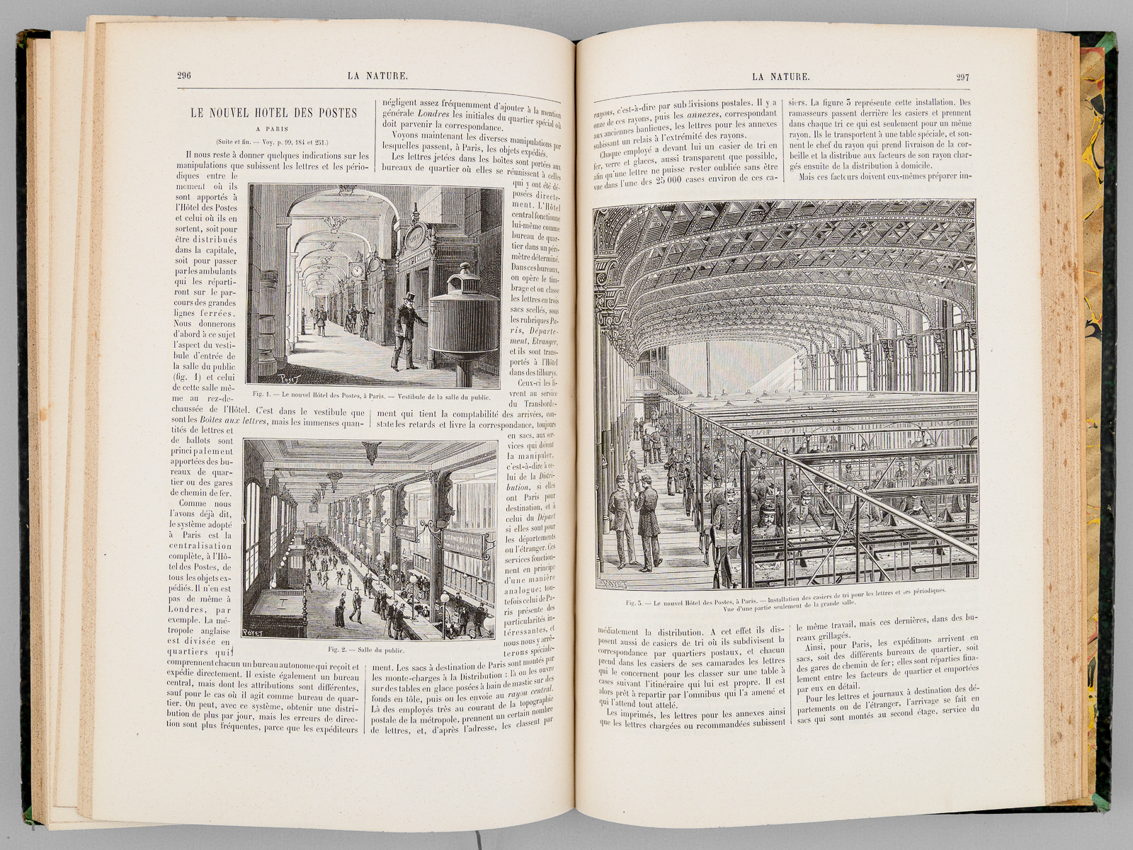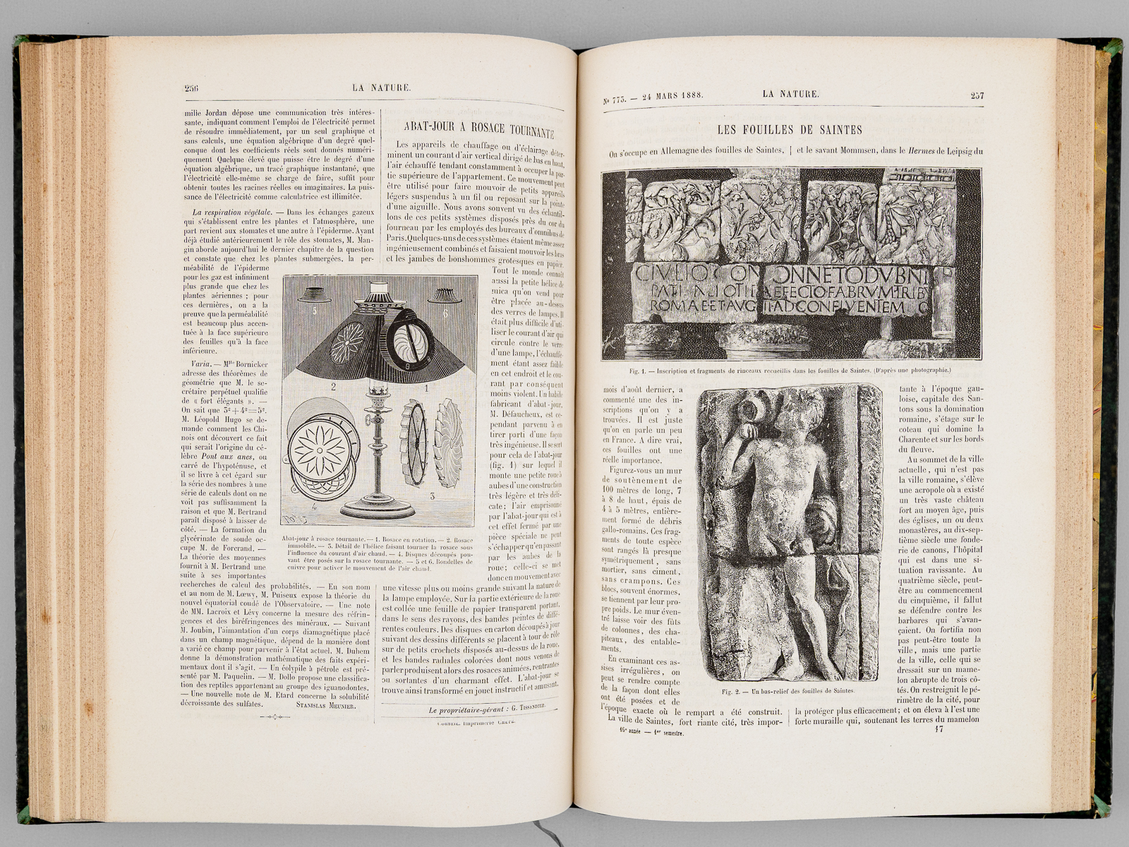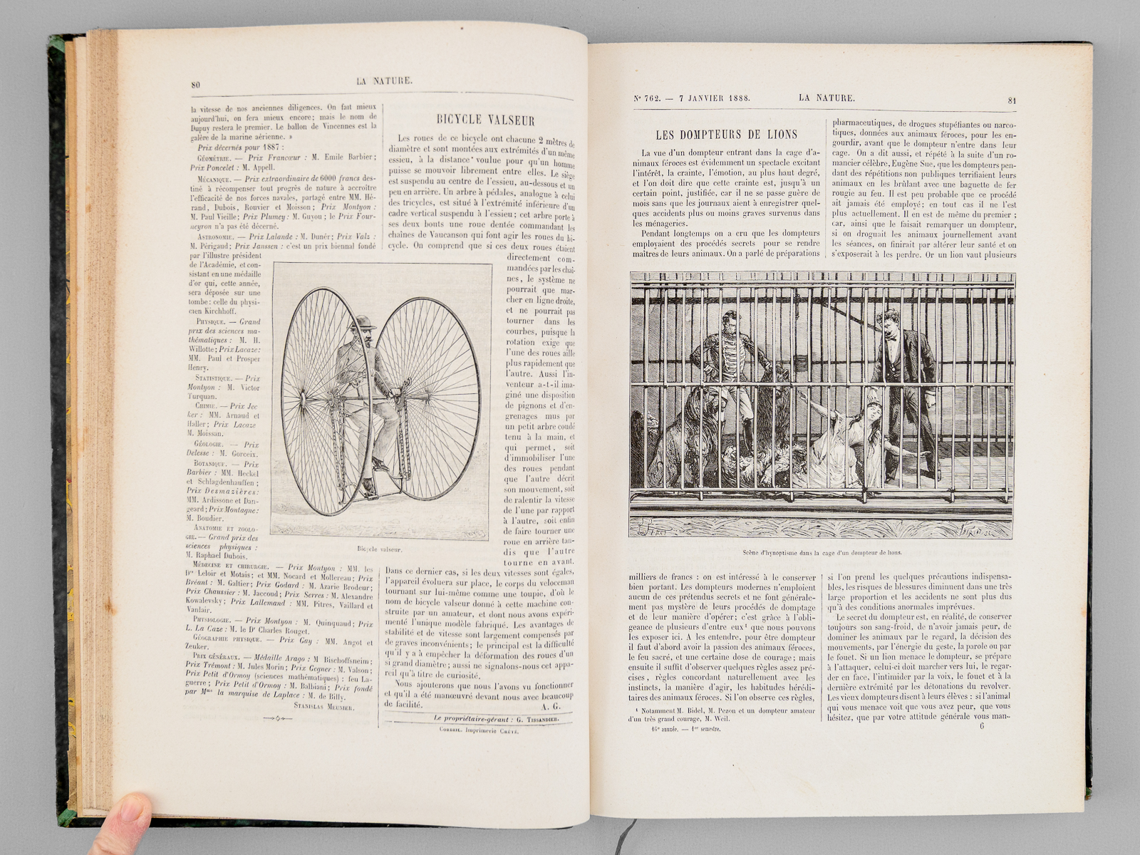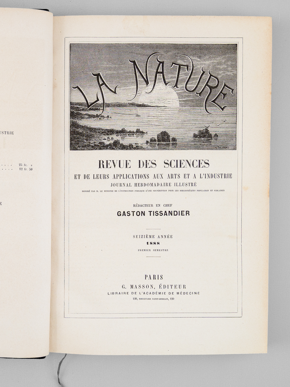 2 vol. in-4 rel. demi-chagrin vert, dos à 4 nerfs, G. Masson éditeur, Paris, 1888, 427 pp. et 427 pp. Au Sommaire notamment : Les fouilles de Saintes ; Le chemin de fer transcaspien ; Exposition Louis XIV et Louis XV de l'hôtel Chimay à Paris ; Les races mexicaines ; Le canal maritime de Manchester ; Les chemins de fer de la Corse ; Les noms propres. Calcul de leurs combinaisons orthographiques ; Transport des torpilleurs par voie ferrée ; Les ascenseurs hydrauliques dans la maison ; Les tramways à air comprimé, de Vincennes à Ville-Evrard ; La science pratique. Appareil fumivore ventilateur ; Siphon automatique intermittent ; Les bières françaises, une visite à l'exposition de 1887 ; Fumivorité des chaudières à vapeur ; Compteur à gaz de poche ; aérorhéomètre ; Appareil pour expériences à haute température au sein d'un gaz sous pression élevée ; Le Pamir ; La prothèse chirurgicale ; Congrès pour l'étude de la tuberculose ; Le cyclonome vélocipédique ; La réforme du calendrier ; L'alimentation d'eau de la Chaux-de-Fonds (Suisse) ; La houille en France ; Mouvements spontanés de certains corps à la surface de quelques liquides ; Le refoulement des eaux potables de la Chaux-de-Fonds en Suisse Plantes bulbeuses d'appartement ; Les chrysanthèmes ; Les vieilles citadelles japonaises ; Eolipyle à essence minérale de M. Paquelin ; Le premier voyage aérien ; L'ombromanie ; La mécanique des jouets ; Récréations scientifiques. Personnages en racines de mandragore et en ceps de vigne ; Joujoux en vieux bouchons ; La vélocipédie ; L'héliographe Maurer ; Des variations de climat et de leurs causes ; Les dompteurs de lions ; La dynamite. Sa fabrication industrielle ; Superficie et population des contrées de la terre ; Le portrait composite. Portrait de famille. Portrait de race ; Tourelle hydrostatique à éclipse ; Tourelle à éclipse à contrepoids accumulateur ; Toupie d'induction de M. Ch. Manet ; Le nouveau phonographe d'Edison ; Le dog-cart électrique de M. Magnus Volk ; Turbine à vapeur et machine dynamo-électrique de M. C. A. Parsons ; Le laboratoire central d'électricité ; Les lampes à incandescence de grande puissance lumineuse ; La navigation électrique sous-marine ; Résolution électrique des équations algébriques ; Sur l'expression de la vitesse des navires ; Application de la photographie à la météorologie ; Les Pyrénées vues de Marseille ; La comète Sawerthal Combustion spontanée ; Le département des manuscrits à la Bibliothèque nationale ; La photographie pratique. Organisation d'un atelier ; Le balance-cuvette de développement ; De la retouche ; Gros bloc dressé sur la moraine du glacier de Görner (Valais) ; Conseils aux amateurs d'histoire naturelle. La chasse aux papillons, etc. ; Un tatou nain. Le chlamydophore tronqué La nouvelle expédition de Stanley ; Le centenaire de La Pérouse ; Le chant. Étude physiologique de la voix humaine par M. A. Piltan ; Rideau de fer de théâtre ; La photographie au théâtre ; Photopoudre ; Appareil filtreur pour l'épuration des huiles de graissage ; Avertisseur universel, système Digéon ; Le mécanisme du vol des oiseaux, éclairé par la photochronographie ; Le lac souterrain des Douzes (Lozère) ; La grotte de Trebiciano ; Un parasite du serpent Python. Un ixode du Sénégal ; La faune des tombeaux ; Académie des sciences ; séances hebdomadaires ; Les sources thermales de Kouripan (Java) ; La tortue monstre de Perpignan ; Le chlamydosaure de King ; Le chelydre de Temminck ; Nouvelle carte photographique du groupe des Pléiades Empreintes fossiles de pas humains, découvertes dans le Nicaragua ; Le tertre du Serpent aux États-Unis. The Serpent Mound ; Les travaux du canal de Panama ; Le puits artésien de la place Hébert à Paris ; L'ours noir d'Amérique ; Sur la destruction des lapins en Australie et dans la Nouvelle-Zélande ; Le palmier bifurqué de Cayenne ; Invention des allumettes chimiques Les produits du Tonkin ; Baleines franches dans les eaux d'Alger ; Bigue de 120 tonnes du port de Marseille ; Le nouveau frein de l'artillerie française ; Une station préhistorique à Champigny Le premier vaisseau français comparé à un navire cuirassé moderne ; Les incendies de coton ; Le passage en hiver des détroits de la mer Baltique ; Les temples souterrains de l'Inde ; Hospices d'animaux et refuges d'oiseaux dans les Indes ; Cérémonies funèbres aux Indes La saccharine ; Cadran d'horloge à aiguilles et chiffres d'heure lumineux ; La chimie de l'amateur ; Cerfs-volants chinois ; Le bateau à pétrole de M. Lenoir ; La neige et le règne animal ; Causerie photographique ; Pierre Belon, à propos de l'érection de sa statue dans la ville du Mans ; La tour Eiffel ; Les aérostats de la mission française en Chine ; Le général Perrier ; Les rubis artificiels. Expériences de MM. Fremy et Verneuil ; Les industries parisiennes : une fabrique de poupées ; Gastrostomie : une remarquable opération chirurgicale suivie d'alimentation stomacale ; Les pluies de sang ; Bibliothèque de La Nature : Moeurs et monuments des peuples préhistoriques par le marquis de Nadaillac ; Tempête de neige ou blizzard aux États-Unis, 11, 12 et 13 mars 1888 ; Les ombres françaises de M. Caran d'Ache ; Les montagnes russes ; La Bastille et la rue Saint-Antoine en 1789 ; L'intelligence des animaux. Les prouesses d'un chien de Terre-Neuve ; Hervé Mangon ; Tricycle à vapeur ; Les stations zoologiques. L'aquarium des Sables-d'Olonne ; Tissus de toiles d'araignées ; La physique sans appareils ; La locomotion terrestre. Les anciennes voitures de voyage ; Bain portatif : système Gaston Bozérian ; L'acide fluorhydrique et la phtisie.