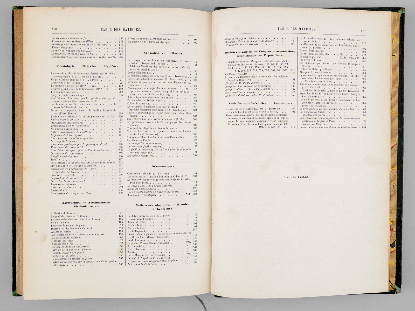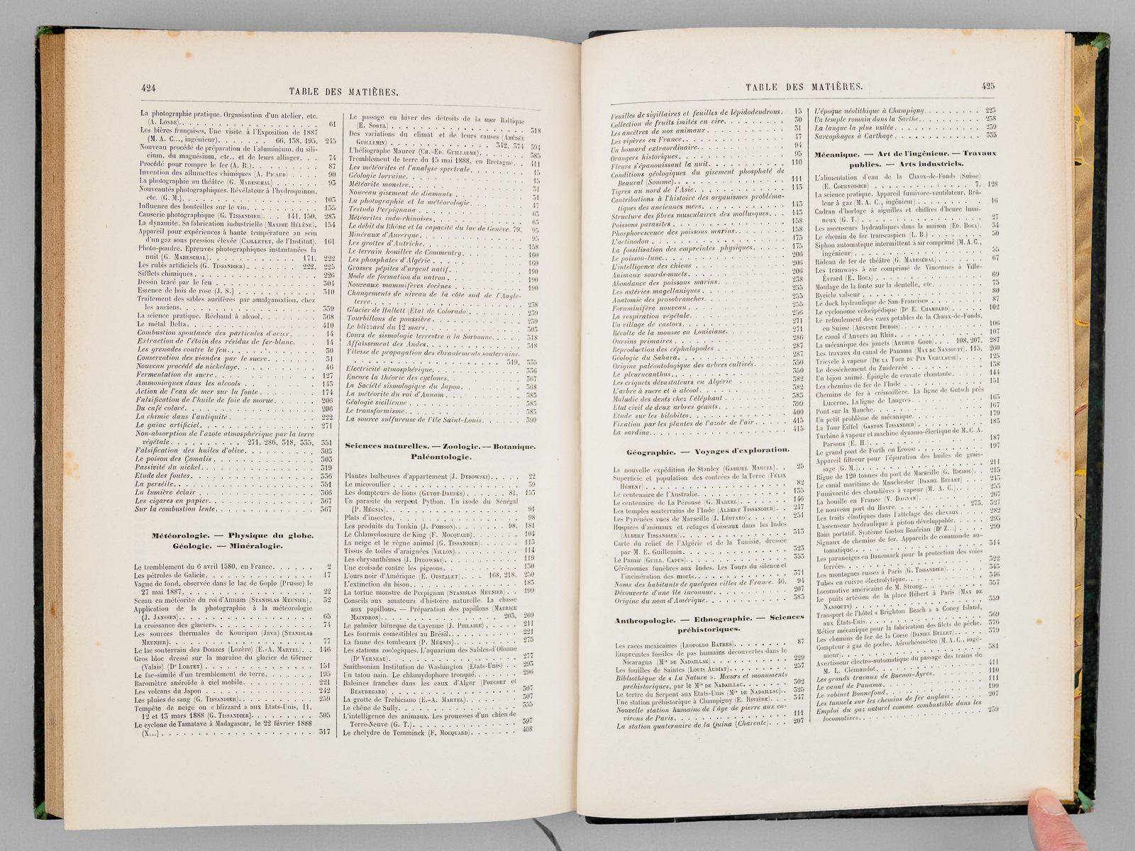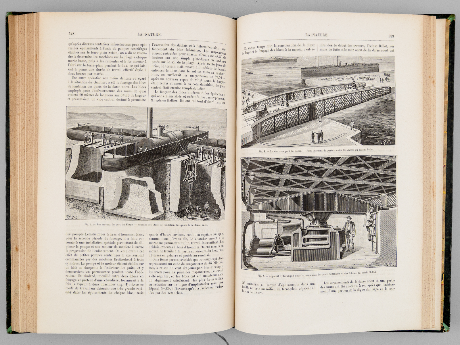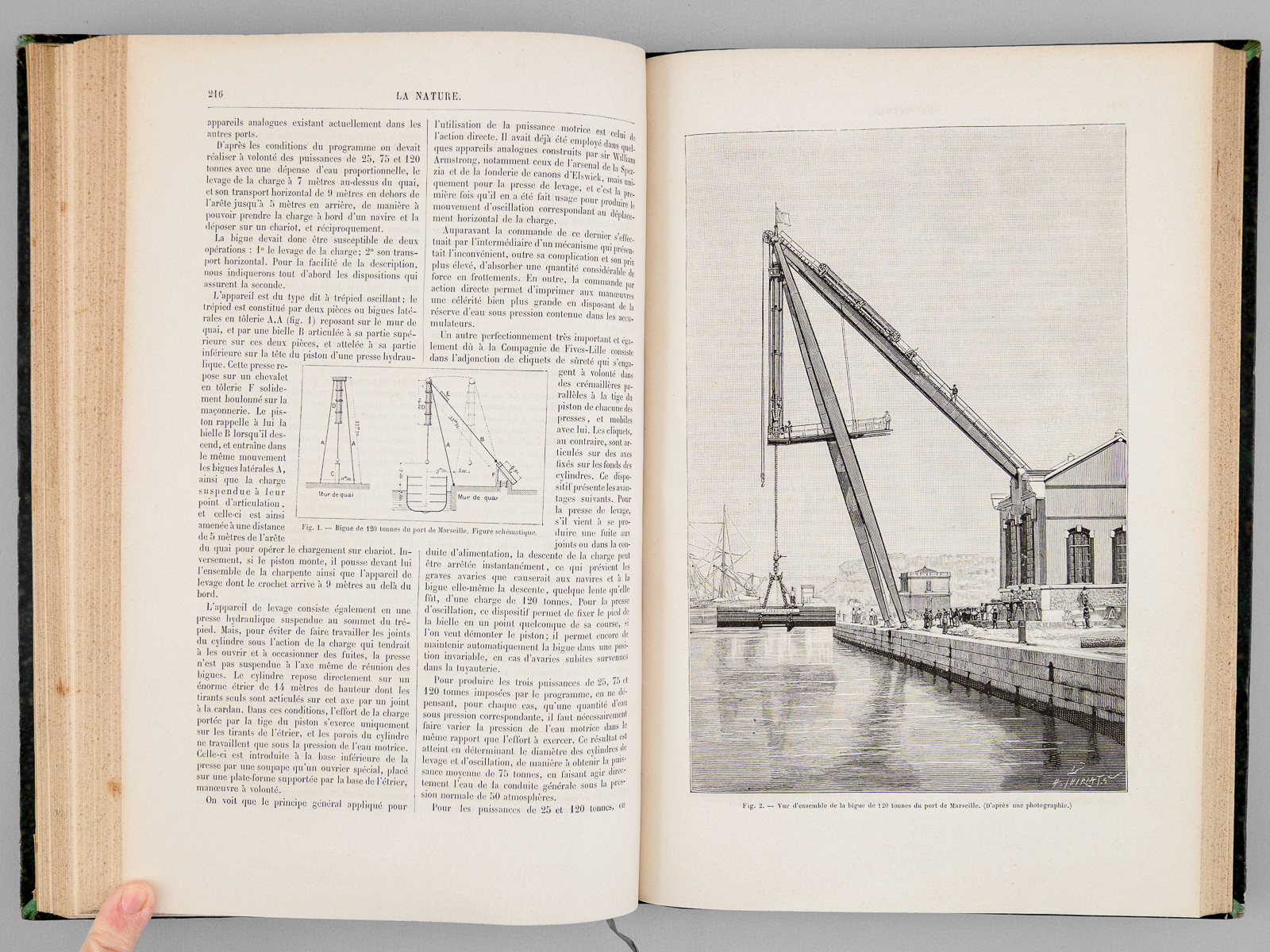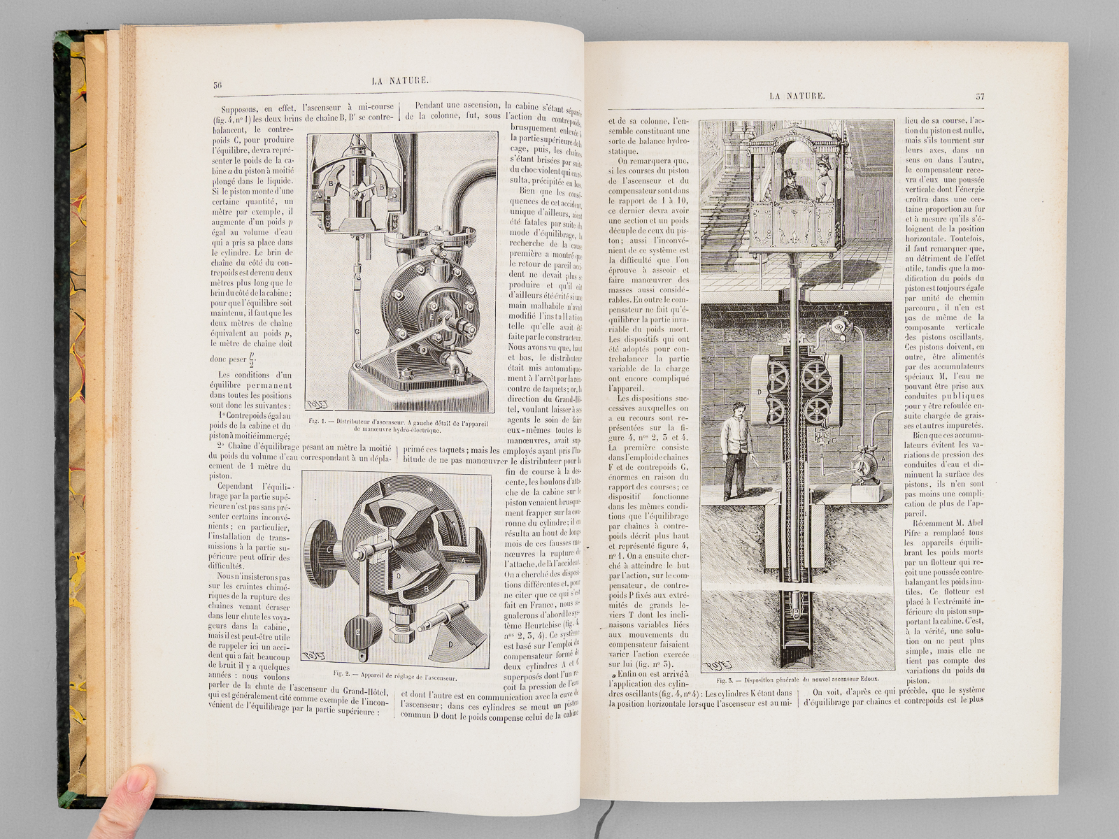 2 vol. in-4 rel. demi-chagrin vert, dos à 4 nerfs, G. Masson éditeur, Paris, 1888, 427 pp. et 427 pp. Au Sommaire notamment : Les fouilles de Saintes ; Le chemin de fer transcaspien ; Exposition Louis XIV et Louis XV de l'hôtel Chimay à Paris ; Les races mexicaines ; Le canal maritime de Manchester ; Les chemins de fer de la Corse ; Les noms propres. Calcul de leurs combinaisons orthographiques ; Transport des torpilleurs par voie ferrée ; Les ascenseurs hydrauliques dans la maison ; Les tramways à air comprimé, de Vincennes à Ville-Evrard ; La science pratique. Appareil fumivore ventilateur ; Siphon automatique intermittent ; Les bières françaises, une visite à l'exposition de 1887 ; Fumivorité des chaudières à vapeur ; Compteur à gaz de poche ; aérorhéomètre ; Appareil pour expériences à haute température au sein d'un gaz sous pression élevée ; Le Pamir ; La prothèse chirurgicale ; Congrès pour l'étude de la tuberculose ; Le cyclonome vélocipédique ; La réforme du calendrier ; L'alimentation d'eau de la Chaux-de-Fonds (Suisse) ; La houille en France ; Mouvements spontanés de certains corps à la surface de quelques liquides ; Le refoulement des eaux potables de la Chaux-de-Fonds en Suisse Plantes bulbeuses d'appartement ; Les chrysanthèmes ; Les vieilles citadelles japonaises ; Eolipyle à essence minérale de M. Paquelin ; Le premier voyage aérien ; L'ombromanie ; La mécanique des jouets ; Récréations scientifiques. Personnages en racines de mandragore et en ceps de vigne ; Joujoux en vieux bouchons ; La vélocipédie ; L'héliographe Maurer ; Des variations de climat et de leurs causes ; Les dompteurs de lions ; La dynamite. Sa fabrication industrielle ; Superficie et population des contrées de la terre ; Le portrait composite. Portrait de famille. Portrait de race ; Tourelle hydrostatique à éclipse ; Tourelle à éclipse à contrepoids accumulateur ; Toupie d'induction de M. Ch. Manet ; Le nouveau phonographe d'Edison ; Le dog-cart électrique de M. Magnus Volk ; Turbine à vapeur et machine dynamo-électrique de M. C. A. Parsons ; Le laboratoire central d'électricité ; Les lampes à incandescence de grande puissance lumineuse ; La navigation électrique sous-marine ; Résolution électrique des équations algébriques ; Sur l'expression de la vitesse des navires ; Application de la photographie à la météorologie ; Les Pyrénées vues de Marseille ; La comète Sawerthal Combustion spontanée ; Le département des manuscrits à la Bibliothèque nationale ; La photographie pratique. Organisation d'un atelier ; Le balance-cuvette de développement ; De la retouche ; Gros bloc dressé sur la moraine du glacier de Görner (Valais) ; Conseils aux amateurs d'histoire naturelle. La chasse aux papillons, etc. ; Un tatou nain. Le chlamydophore tronqué La nouvelle expédition de Stanley ; Le centenaire de La Pérouse ; Le chant. Étude physiologique de la voix humaine par M. A. Piltan ; Rideau de fer de théâtre ; La photographie au théâtre ; Photopoudre ; Appareil filtreur pour l'épuration des huiles de graissage ; Avertisseur universel, système Digéon ; Le mécanisme du vol des oiseaux, éclairé par la photochronographie ; Le lac souterrain des Douzes (Lozère) ; La grotte de Trebiciano ; Un parasite du serpent Python. Un ixode du Sénégal ; La faune des tombeaux ; Académie des sciences ; séances hebdomadaires ; Les sources thermales de Kouripan (Java) ; La tortue monstre de Perpignan ; Le chlamydosaure de King ; Le chelydre de Temminck ; Nouvelle carte photographique du groupe des Pléiades Empreintes fossiles de pas humains, découvertes dans le Nicaragua ; Le tertre du Serpent aux États-Unis. The Serpent Mound ; Les travaux du canal de Panama ; Le puits artésien de la place Hébert à Paris ; L'ours noir d'Amérique ; Sur la destruction des lapins en Australie et dans la Nouvelle-Zélande ; Le palmier bifurqué de Cayenne ; Invention des allumettes chimiques Les produits du Tonkin ; Baleines franches dans les eaux d'Alger ; Bigue de 120 tonnes du port de Marseille ; Le nouveau frein de l'artillerie française ; Une station préhistorique à Champigny Le premier vaisseau français comparé à un navire cuirassé moderne ; Les incendies de coton ; Le passage en hiver des détroits de la mer Baltique ; Les temples souterrains de l'Inde ; Hospices d'animaux et refuges d'oiseaux dans les Indes ; Cérémonies funèbres aux Indes La saccharine ; Cadran d'horloge à aiguilles et chiffres d'heure lumineux ; La chimie de l'amateur ; Cerfs-volants chinois ; Le bateau à pétrole de M. Lenoir ; La neige et le règne animal ; Causerie photographique ; Pierre Belon, à propos de l'érection de sa statue dans la ville du Mans ; La tour Eiffel ; Les aérostats de la mission française en Chine ; Le général Perrier ; Les rubis artificiels. Expériences de MM. Fremy et Verneuil ; Les industries parisiennes : une fabrique de poupées ; Gastrostomie : une remarquable opération chirurgicale suivie d'alimentation stomacale ; Les pluies de sang ; Bibliothèque de La Nature : Moeurs et monuments des peuples préhistoriques par le marquis de Nadaillac ; Tempête de neige ou blizzard aux États-Unis, 11, 12 et 13 mars 1888 ; Les ombres françaises de M. Caran d'Ache ; Les montagnes russes ; La Bastille et la rue Saint-Antoine en 1789 ; L'intelligence des animaux. Les prouesses d'un chien de Terre-Neuve ; Hervé Mangon ; Tricycle à vapeur ; Les stations zoologiques. L'aquarium des Sables-d'Olonne ; Tissus de toiles d'araignées ; La physique sans appareils ; La locomotion terrestre. Les anciennes voitures de voyage ; Bain portatif : système Gaston Bozérian ; L'acide fluorhydrique et la phtisie.