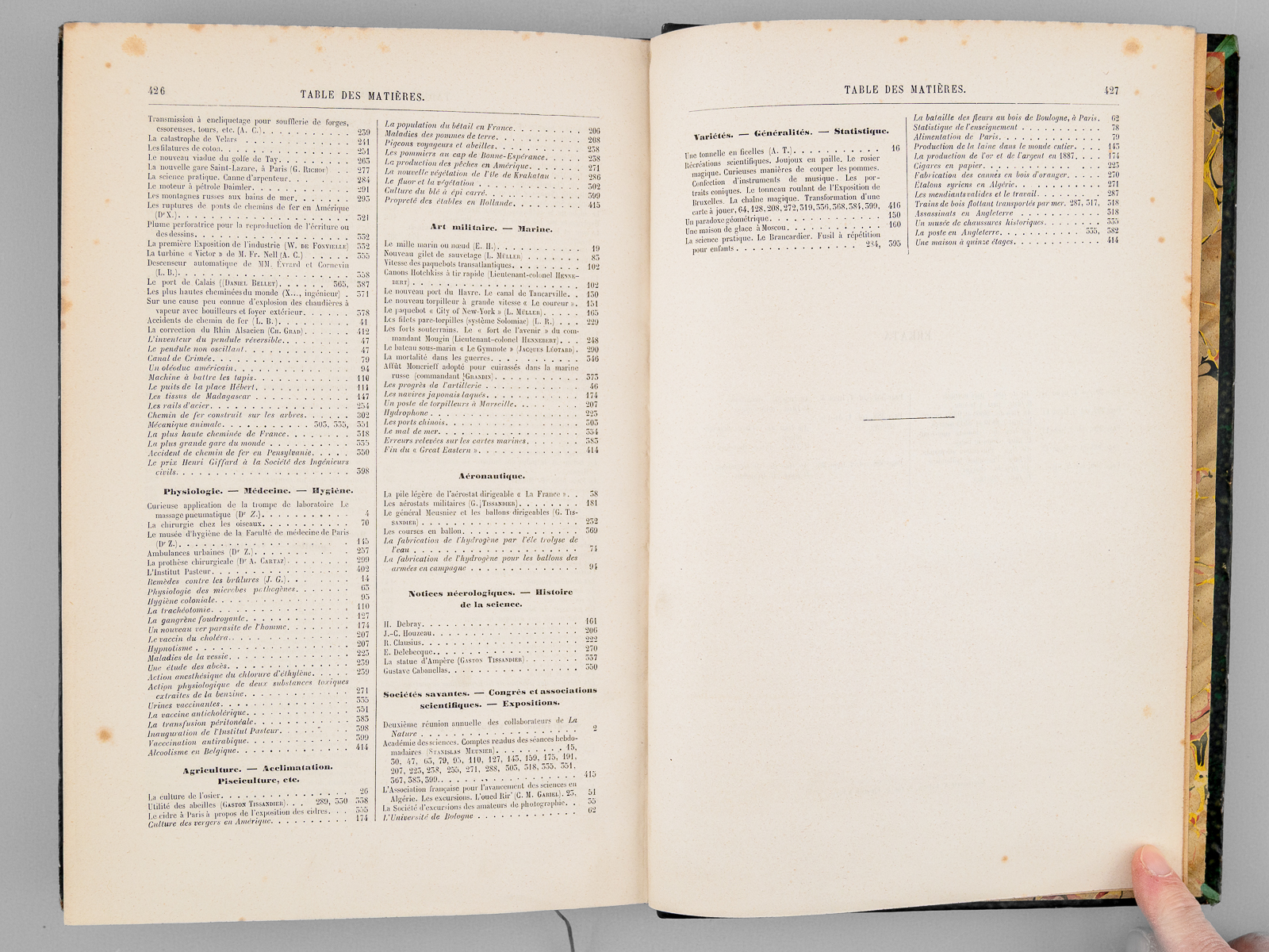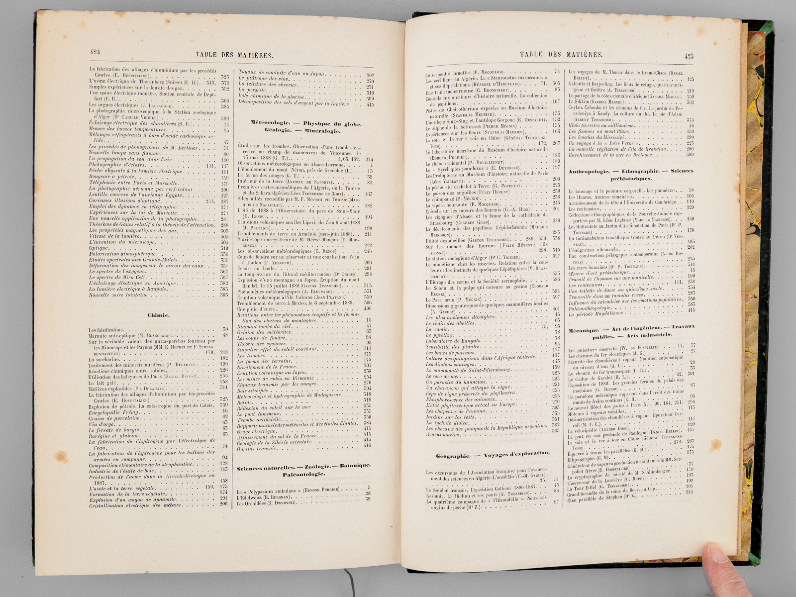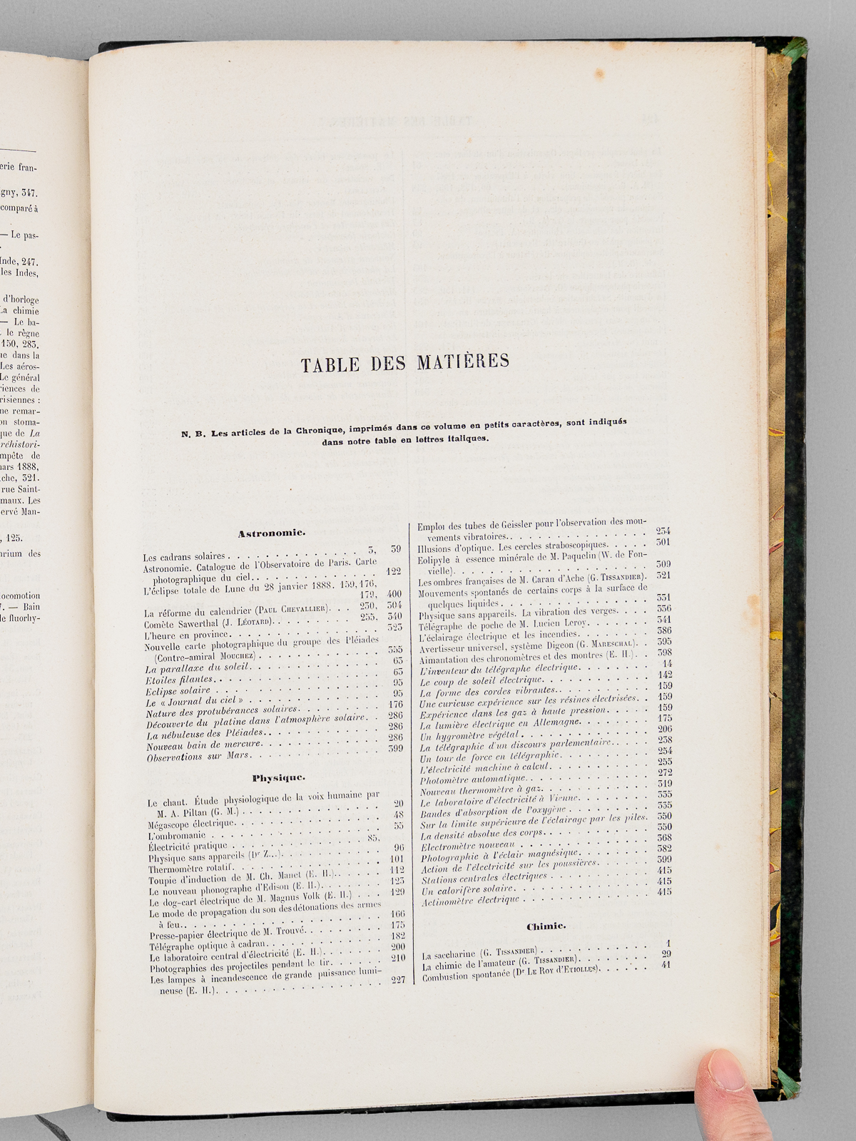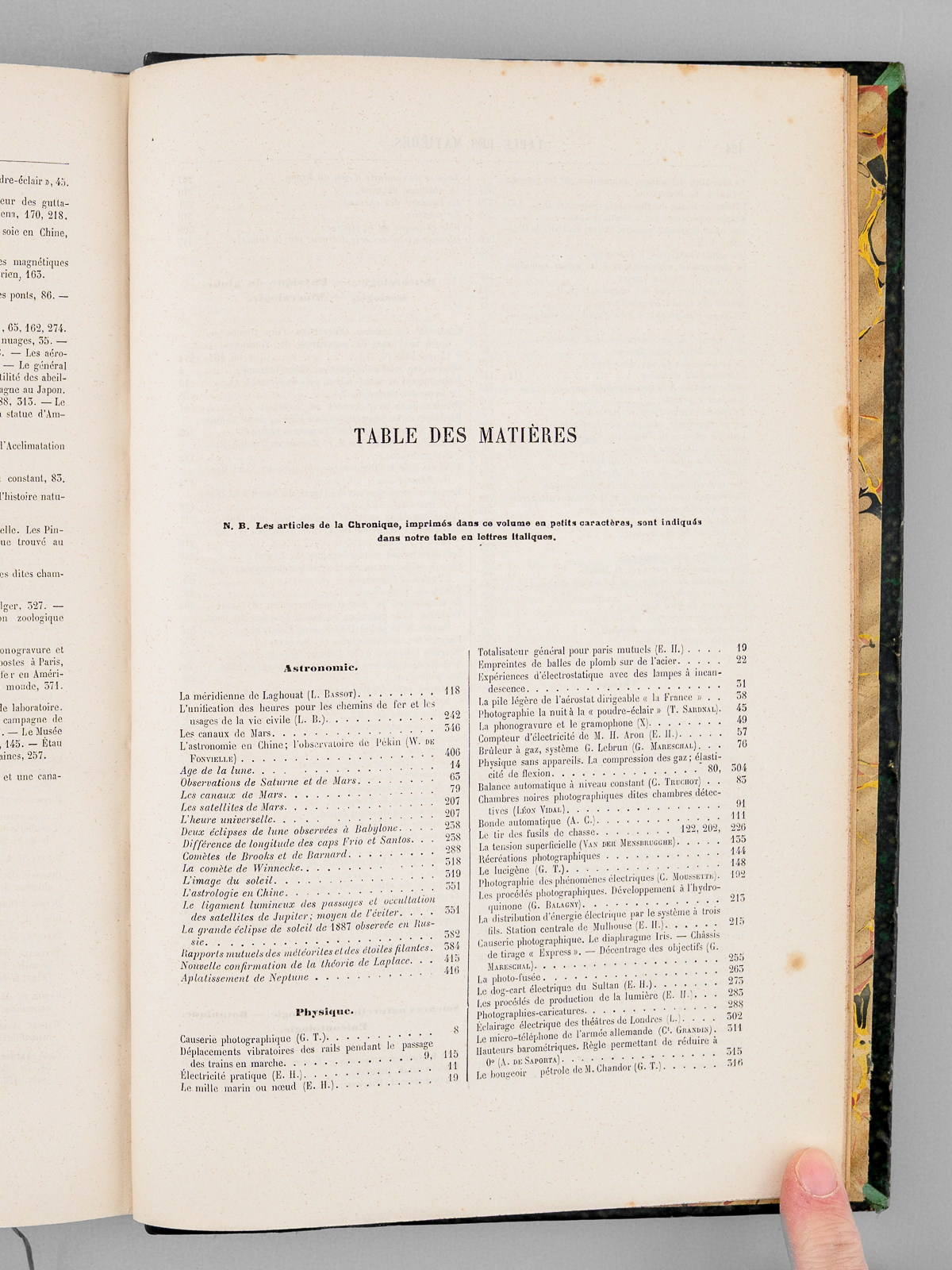 2 vol. in-4 rel. demi-chagrin vert, dos à 4 nerfs, G. Masson éditeur, Paris, 1888, 427 pp. et 427 pp. Au Sommaire notamment : Les fouilles de Saintes ; Le chemin de fer transcaspien ; Exposition Louis XIV et Louis XV de l'hôtel Chimay à Paris ; Les races mexicaines ; Le canal maritime de Manchester ; Les chemins de fer de la Corse ; Les noms propres. Calcul de leurs combinaisons orthographiques ; Transport des torpilleurs par voie ferrée ; Les ascenseurs hydrauliques dans la maison ; Les tramways à air comprimé, de Vincennes à Ville-Evrard ; La science pratique. Appareil fumivore ventilateur ; Siphon automatique intermittent ; Les bières françaises, une visite à l'exposition de 1887 ; Fumivorité des chaudières à vapeur ; Compteur à gaz de poche ; aérorhéomètre ; Appareil pour expériences à haute température au sein d'un gaz sous pression élevée ; Le Pamir ; La prothèse chirurgicale ; Congrès pour l'étude de la tuberculose ; Le cyclonome vélocipédique ; La réforme du calendrier ; L'alimentation d'eau de la Chaux-de-Fonds (Suisse) ; La houille en France ; Mouvements spontanés de certains corps à la surface de quelques liquides ; Le refoulement des eaux potables de la Chaux-de-Fonds en Suisse Plantes bulbeuses d'appartement ; Les chrysanthèmes ; Les vieilles citadelles japonaises ; Eolipyle à essence minérale de M. Paquelin ; Le premier voyage aérien ; L'ombromanie ; La mécanique des jouets ; Récréations scientifiques. Personnages en racines de mandragore et en ceps de vigne ; Joujoux en vieux bouchons ; La vélocipédie ; L'héliographe Maurer ; Des variations de climat et de leurs causes ; Les dompteurs de lions ; La dynamite. Sa fabrication industrielle ; Superficie et population des contrées de la terre ; Le portrait composite. Portrait de famille. Portrait de race ; Tourelle hydrostatique à éclipse ; Tourelle à éclipse à contrepoids accumulateur ; Toupie d'induction de M. Ch. Manet ; Le nouveau phonographe d'Edison ; Le dog-cart électrique de M. Magnus Volk ; Turbine à vapeur et machine dynamo-électrique de M. C. A. Parsons ; Le laboratoire central d'électricité ; Les lampes à incandescence de grande puissance lumineuse ; La navigation électrique sous-marine ; Résolution électrique des équations algébriques ; Sur l'expression de la vitesse des navires ; Application de la photographie à la météorologie ; Les Pyrénées vues de Marseille ; La comète Sawerthal Combustion spontanée ; Le département des manuscrits à la Bibliothèque nationale ; La photographie pratique. Organisation d'un atelier ; Le balance-cuvette de développement ; De la retouche ; Gros bloc dressé sur la moraine du glacier de Görner (Valais) ; Conseils aux amateurs d'histoire naturelle. La chasse aux papillons, etc. ; Un tatou nain. Le chlamydophore tronqué La nouvelle expédition de Stanley ; Le centenaire de La Pérouse ; Le chant. Étude physiologique de la voix humaine par M. A. Piltan ; Rideau de fer de théâtre ; La photographie au théâtre ; Photopoudre ; Appareil filtreur pour l'épuration des huiles de graissage ; Avertisseur universel, système Digéon ; Le mécanisme du vol des oiseaux, éclairé par la photochronographie ; Le lac souterrain des Douzes (Lozère) ; La grotte de Trebiciano ; Un parasite du serpent Python. Un ixode du Sénégal ; La faune des tombeaux ; Académie des sciences ; séances hebdomadaires ; Les sources thermales de Kouripan (Java) ; La tortue monstre de Perpignan ; Le chlamydosaure de King ; Le chelydre de Temminck ; Nouvelle carte photographique du groupe des Pléiades Empreintes fossiles de pas humains, découvertes dans le Nicaragua ; Le tertre du Serpent aux États-Unis. The Serpent Mound ; Les travaux du canal de Panama ; Le puits artésien de la place Hébert à Paris ; L'ours noir d'Amérique ; Sur la destruction des lapins en Australie et dans la Nouvelle-Zélande ; Le palmier bifurqué de Cayenne ; Invention des allumettes chimiques Les produits du Tonkin ; Baleines franches dans les eaux d'Alger ; Bigue de 120 tonnes du port de Marseille ; Le nouveau frein de l'artillerie française ; Une station préhistorique à Champigny Le premier vaisseau français comparé à un navire cuirassé moderne ; Les incendies de coton ; Le passage en hiver des détroits de la mer Baltique ; Les temples souterrains de l'Inde ; Hospices d'animaux et refuges d'oiseaux dans les Indes ; Cérémonies funèbres aux Indes La saccharine ; Cadran d'horloge à aiguilles et chiffres d'heure lumineux ; La chimie de l'amateur ; Cerfs-volants chinois ; Le bateau à pétrole de M. Lenoir ; La neige et le règne animal ; Causerie photographique ; Pierre Belon, à propos de l'érection de sa statue dans la ville du Mans ; La tour Eiffel ; Les aérostats de la mission française en Chine ; Le général Perrier ; Les rubis artificiels. Expériences de MM. Fremy et Verneuil ; Les industries parisiennes : une fabrique de poupées ; Gastrostomie : une remarquable opération chirurgicale suivie d'alimentation stomacale ; Les pluies de sang ; Bibliothèque de La Nature : Moeurs et monuments des peuples préhistoriques par le marquis de Nadaillac ; Tempête de neige ou blizzard aux États-Unis, 11, 12 et 13 mars 1888 ; Les ombres françaises de M. Caran d'Ache ; Les montagnes russes ; La Bastille et la rue Saint-Antoine en 1789 ; L'intelligence des animaux. Les prouesses d'un chien de Terre-Neuve ; Hervé Mangon ; Tricycle à vapeur ; Les stations zoologiques. L'aquarium des Sables-d'Olonne ; Tissus de toiles d'araignées ; La physique sans appareils ; La locomotion terrestre. Les anciennes voitures de voyage ; Bain portatif : système Gaston Bozérian ; L'acide fluorhydrique et la phtisie.