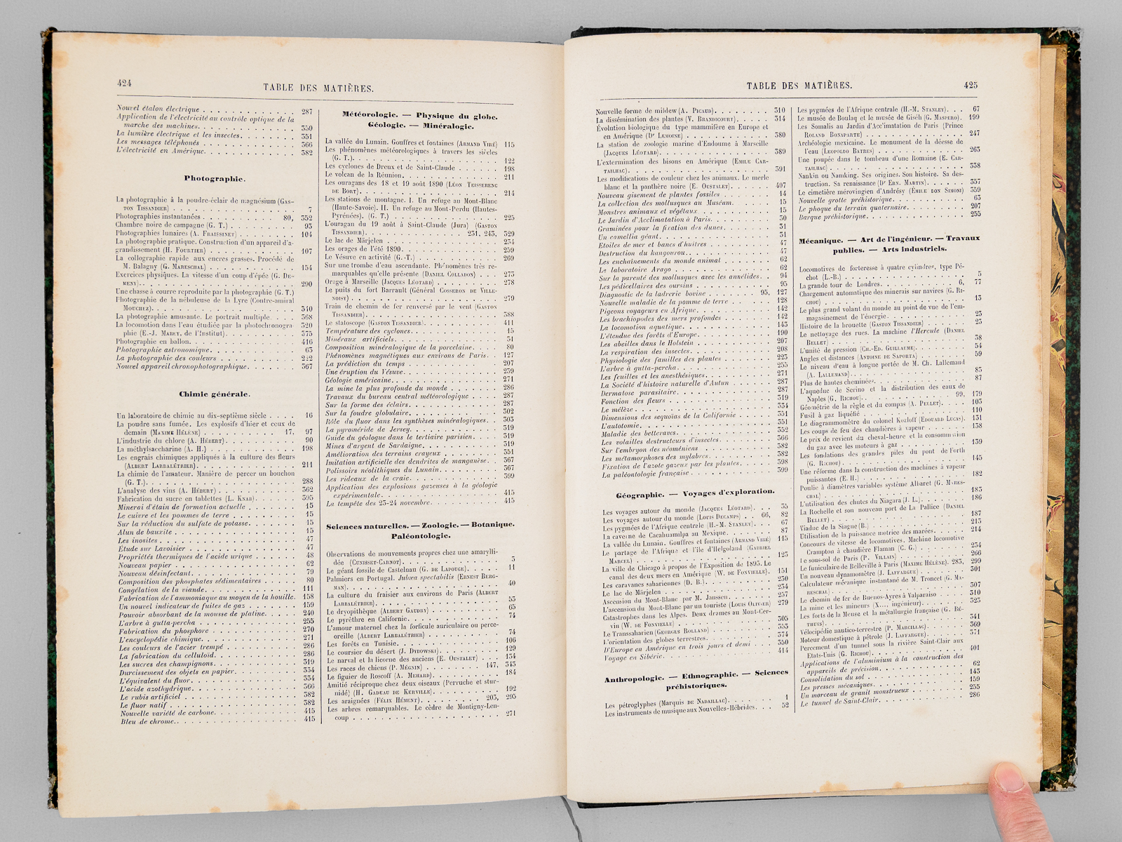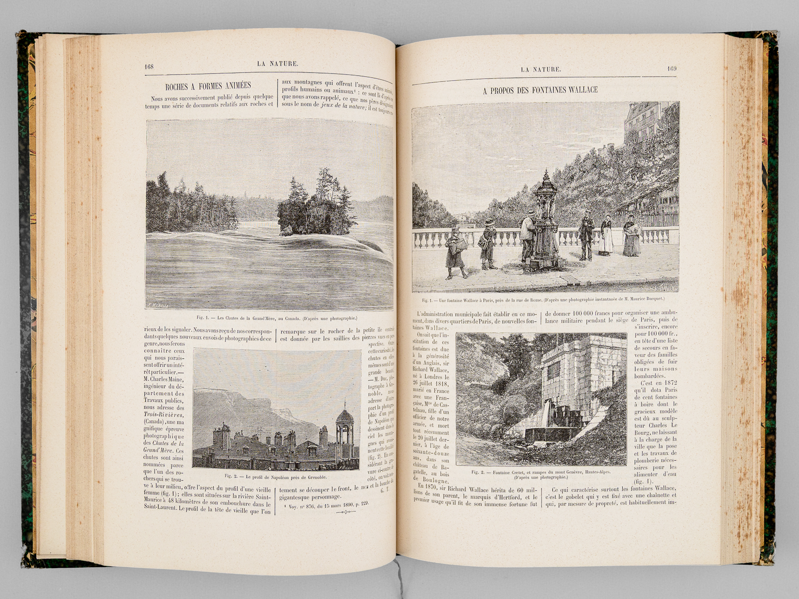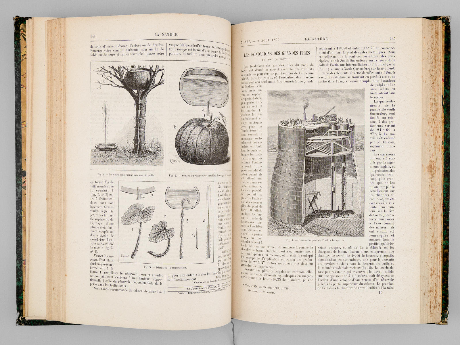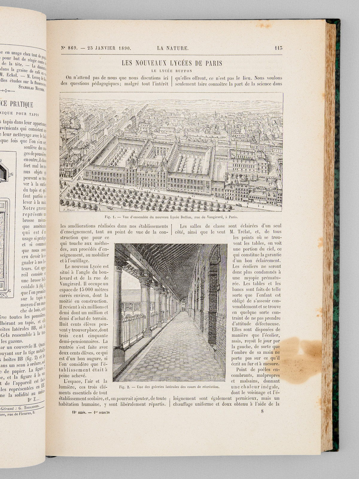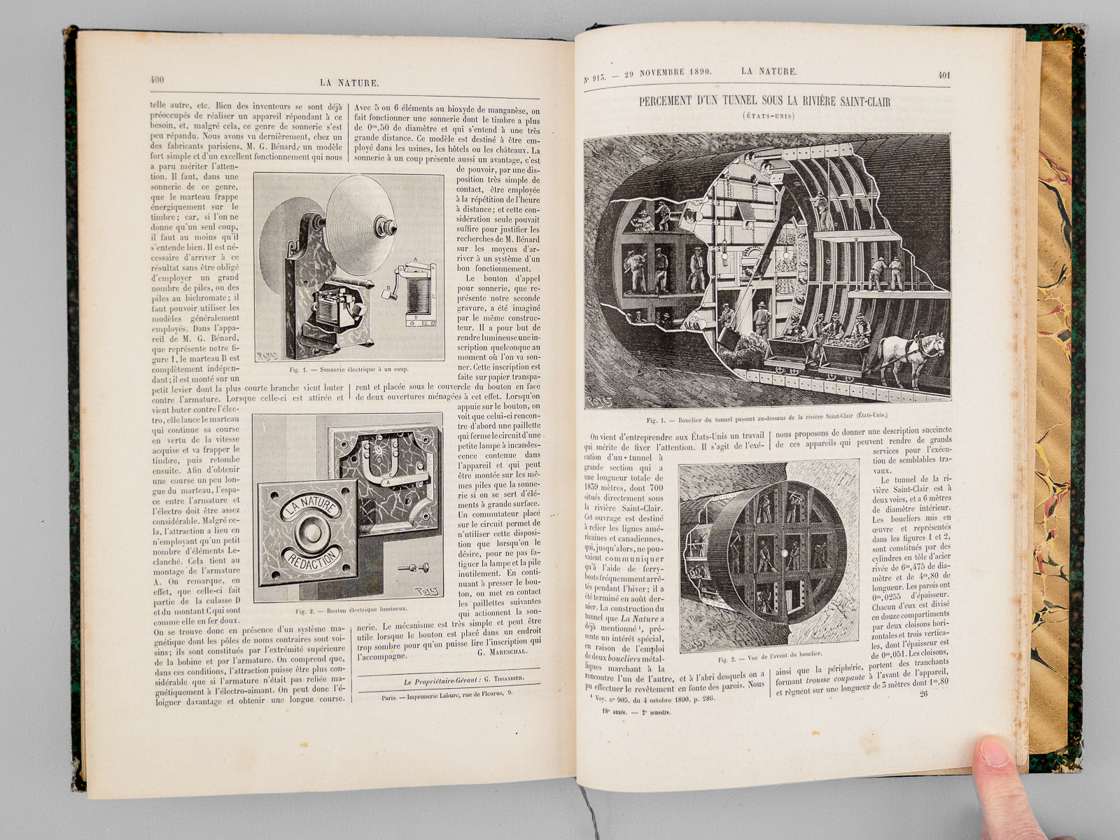 2 vol. in-4 rel. demi-chagrin vert, dos à 4 nerfs, G. Masson éditeur, Paris, 1890, 427 pp. et 427 pp. Au Sommaire notamment : La fabrication du lait condensé en Suisse ; La science au théâtre. L'illusion sur les toiles métalliques ; Les observations météorologiques de la Tour Eiffel ; Locomotives de forteresse à quatre cylindres type Péchot ; Pierre Bayen ; Étude sur la formation des images composites ; Archéologie mexicaine. Le monument de la Déesse de l'eau ; Le nettoyage des rues. La machine l'Hercule ; La taille des silex ; Les fêtes publiques ; Palmiers en Portugal. Jubæa spectabilis ; Un pont suspendu militaire ; Les Somalis au Jardin d'Acclimatation de Paris ; La dissémination des plantes ; Une poupée dans le tombeau d'une Romaine ; Le Catha edulis ; Moulage méthodique du verre ; Sur une trombe d'eau ascendante ; Le puits du fort Barrault ; Observations de mouvements propres chez une amaryllidée ; Les voyages autour du monde ; Les exercices physiques. La vitesse d'un coup d'épée ; Le royaume de Dahomey Le jet d'eau ; Les mirages supérieurs ; Le Hoche, cuirassé d'escadre français ; Le coursier du désert ; Les transports à Minas Geraes, au Brésil ; Le lait condensé ; La ville de Chicago à propos de l'Exposition de 1893 ; La photographie pratique. Construction d'un appareil d'agrandissement ; Photographies lunaires ; Le grisou, à propos de la catastrophe de Saint-Étienne du 20 juillet 1890 ; Dermographie ou autographisme ; Le dryopithèque ; La maladie des pommes de terre et le moyen de la combattre ; Congrès des américanistes. Huitième session à Paris ; Pistolet inoffensif à flèche pneumatique ; L'exploitation du pétrole à Pechelbronn, en Alsace ; Vérificateur de monnaie ; L'unité de pression ; L'industrie du chlore ; La poudre sans fumée. Les explosifs d'hier et ceux de demain ; Les araignées ; Les hirondelles messagères Le cinquantenaire de la réforme postale anglaise ; Ascension du Mont-Blanc ; Amitié réciproque de deux oiseaux ; Bateaux à vapeur de naphte. Launches de MM. Escher Wyss ; Réglementation de la pêche du saumon au Parlement ; L'éclairage électrique des navires ; Le niveau d'eau à longue portée de M. Ch. Lallemand ; L'ostréiculture ; Le géant fossile de Castelnau ; La culture du fraisier aux environs de Paris ; Tension superficielle ; Évolution biologique du type mammifère en Europe et en Amérique ; Les voyages autour du monde ; Les fraises au point de vue thérapeutique ; Exposition de Tokio au Japon, en 1890 ; La science au théâtre. Jeanne d'Arc à l'Hippodrome de Paris ; Le diagrammomètre du colonel Kozloff ; Le partage de l'Afrique et l'île d'Helgoland ; Vélocipédie nautico-terrestre ; Trucs de théâtre. La féerie les Pilules du Diable Agrandissement des clichés photographiques par l'extension de la pellicule ; La locomotion dans l'eau étudiée par la photochronographie ; Le soufflet musical ; Les eaux souterraines des Causses ; Nankin ou Namking ; Le musée de Boulaq et le musée de Gizeh ; Les Touareg Les races de chiens ; Le figuier de Roscoff ; Les fraises au point de vue thérapeutique ; Du mimétisme chez le Phyllopteryx eques ; Photographie de la nébuleuse de la Lyre ; Les pétroglyphes ; Le phare de Port-Vendres ; L'ascension du Mont-Blanc par un touriste ; Le Narval et la Licorne des anciens ; La culture de l'osier en Allemagne ; Géométrie de la règle et du compas ; Nouvelle forme de mildew ; Orages et inondations en Sicile ; La photographie la nuit. Revolver photogénique ; Un bateau insubmersible. Le Neversink ; La fabrication actuelle du papier ; Variation de la température moyenne de l'air à Paris ; Une mine exploitée par les mineurs. La concession de Riancé ; Chargement automatique des minerais sur navire ; Les cosaques de l'Oural ; Le Transsaharien ; Angles et distances ; Le Bec-Croisé des Pins ; Montmartre vignoble ; Le cimetière mérovingien d'Andrésy ; Les pygmées de l'Afrique centrale L'éventail du ballet Le Rêve, à l'Opéra de Paris ; Un guérisseur « au secret » devant la science moderne ; Les ouragans des 18 et 19 août 1890 ; La photographie à la poudre-éclair de magnésium ; Le cheval sauvage de la Dzoungarie, Equus Przewalskii ; La Tunisie à l'Exposition universelle de 1889 ; La photographie avec un trou d'aiguille ; Nouveau filet pélagique à fonctionnement automatique ; Le sous-sol de Paris ; La vallée du Lunain, gouffres et fontaines ; L'anthophagie ; Un manège électrique ; La sauteuse de corde. L'éléphant mécanique