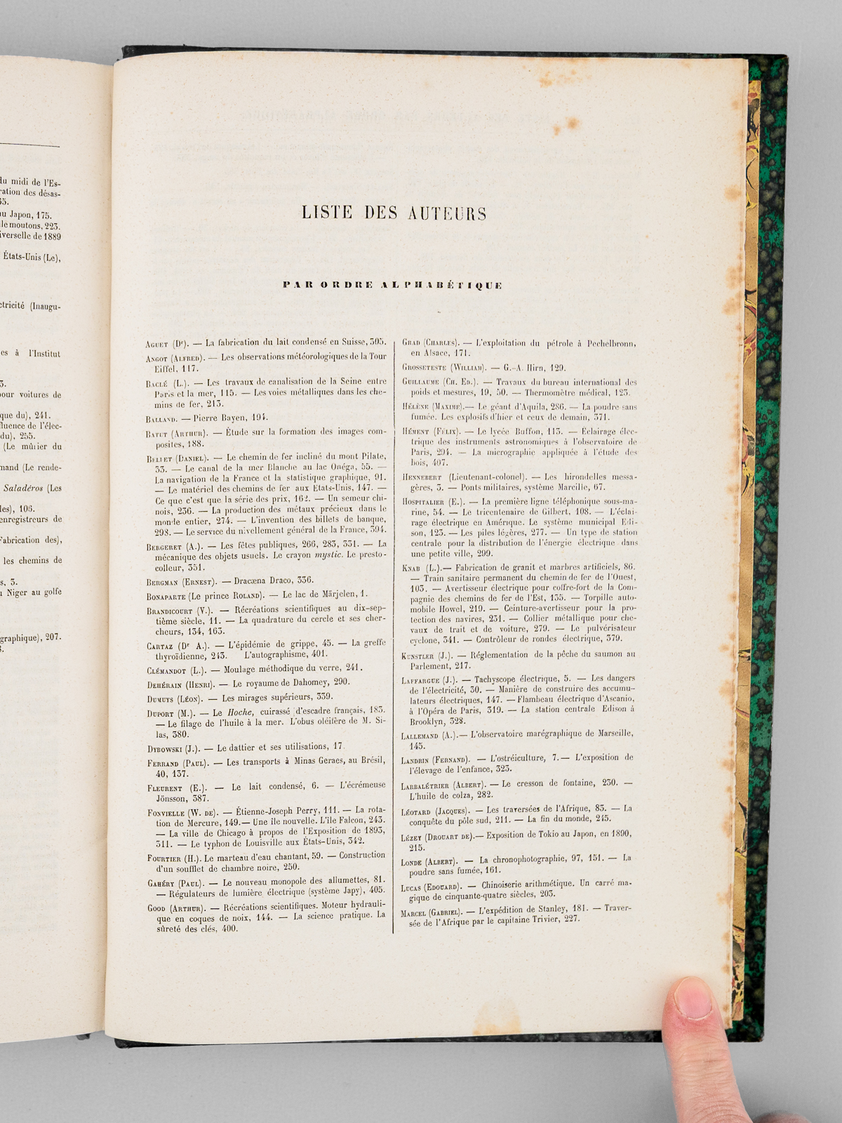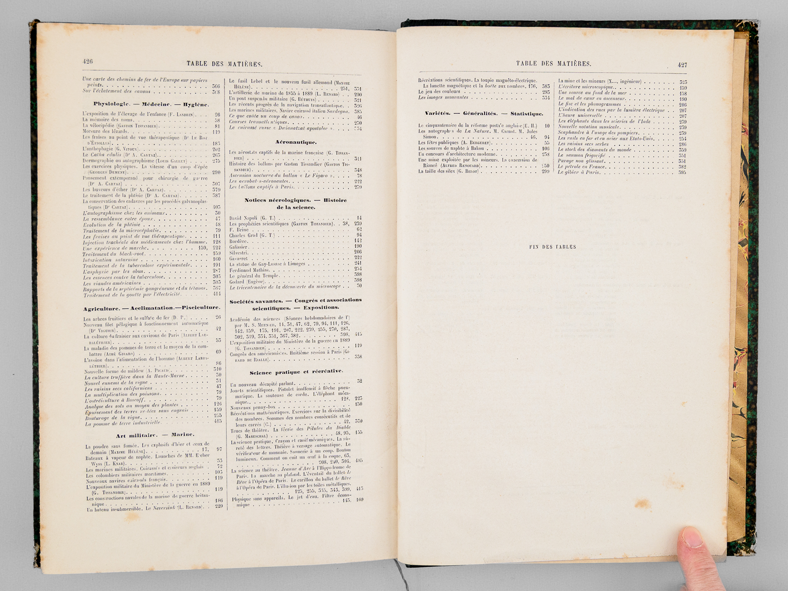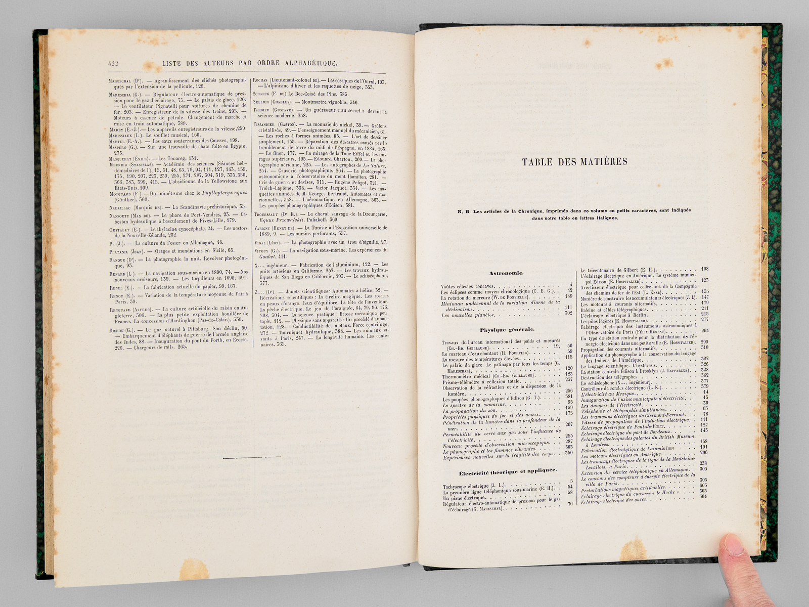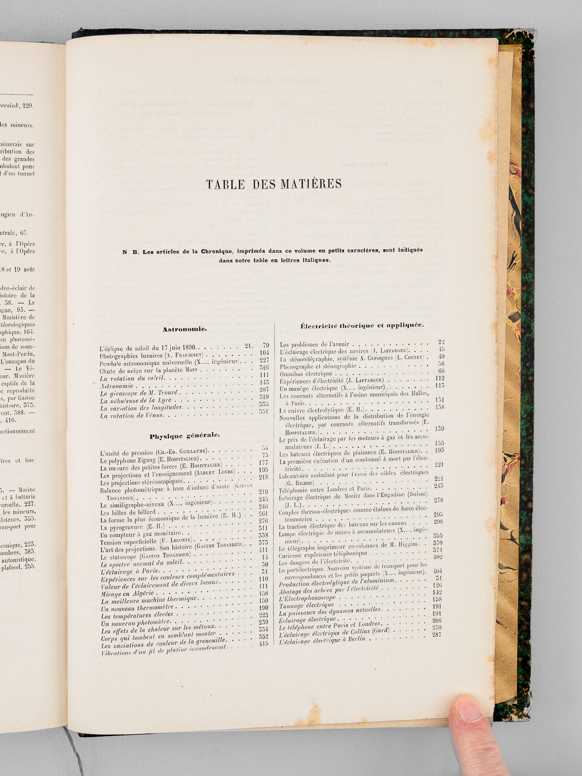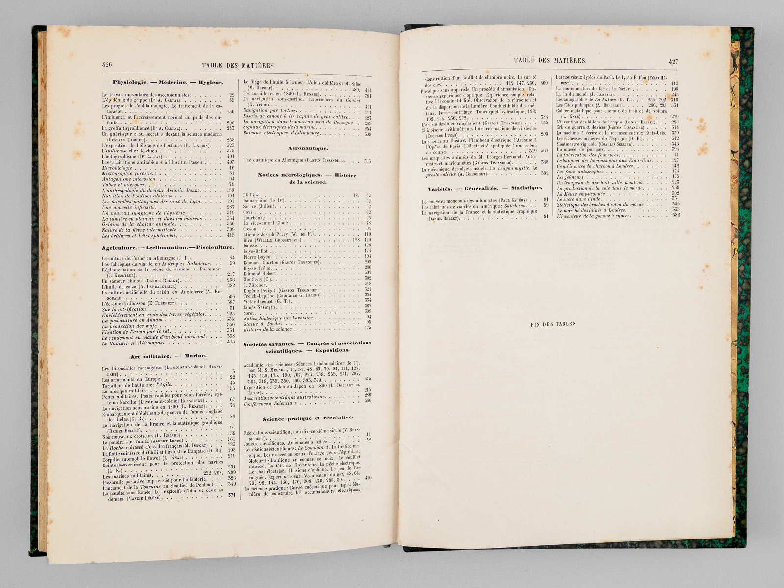 2 vol. in-4 rel. demi-chagrin vert, dos à 4 nerfs, G. Masson éditeur, Paris, 1890, 427 pp. et 427 pp. Au Sommaire notamment : La fabrication du lait condensé en Suisse ; La science au théâtre. L'illusion sur les toiles métalliques ; Les observations météorologiques de la Tour Eiffel ; Locomotives de forteresse à quatre cylindres type Péchot ; Pierre Bayen ; Étude sur la formation des images composites ; Archéologie mexicaine. Le monument de la Déesse de l'eau ; Le nettoyage des rues. La machine l'Hercule ; La taille des silex ; Les fêtes publiques ; Palmiers en Portugal. Jubæa spectabilis ; Un pont suspendu militaire ; Les Somalis au Jardin d'Acclimatation de Paris ; La dissémination des plantes ; Une poupée dans le tombeau d'une Romaine ; Le Catha edulis ; Moulage méthodique du verre ; Sur une trombe d'eau ascendante ; Le puits du fort Barrault ; Observations de mouvements propres chez une amaryllidée ; Les voyages autour du monde ; Les exercices physiques. La vitesse d'un coup d'épée ; Le royaume de Dahomey Le jet d'eau ; Les mirages supérieurs ; Le Hoche, cuirassé d'escadre français ; Le coursier du désert ; Les transports à Minas Geraes, au Brésil ; Le lait condensé ; La ville de Chicago à propos de l'Exposition de 1893 ; La photographie pratique. Construction d'un appareil d'agrandissement ; Photographies lunaires ; Le grisou, à propos de la catastrophe de Saint-Étienne du 20 juillet 1890 ; Dermographie ou autographisme ; Le dryopithèque ; La maladie des pommes de terre et le moyen de la combattre ; Congrès des américanistes. Huitième session à Paris ; Pistolet inoffensif à flèche pneumatique ; L'exploitation du pétrole à Pechelbronn, en Alsace ; Vérificateur de monnaie ; L'unité de pression ; L'industrie du chlore ; La poudre sans fumée. Les explosifs d'hier et ceux de demain ; Les araignées ; Les hirondelles messagères Le cinquantenaire de la réforme postale anglaise ; Ascension du Mont-Blanc ; Amitié réciproque de deux oiseaux ; Bateaux à vapeur de naphte. Launches de MM. Escher Wyss ; Réglementation de la pêche du saumon au Parlement ; L'éclairage électrique des navires ; Le niveau d'eau à longue portée de M. Ch. Lallemand ; L'ostréiculture ; Le géant fossile de Castelnau ; La culture du fraisier aux environs de Paris ; Tension superficielle ; Évolution biologique du type mammifère en Europe et en Amérique ; Les voyages autour du monde ; Les fraises au point de vue thérapeutique ; Exposition de Tokio au Japon, en 1890 ; La science au théâtre. Jeanne d'Arc à l'Hippodrome de Paris ; Le diagrammomètre du colonel Kozloff ; Le partage de l'Afrique et l'île d'Helgoland ; Vélocipédie nautico-terrestre ; Trucs de théâtre. La féerie les Pilules du Diable Agrandissement des clichés photographiques par l'extension de la pellicule ; La locomotion dans l'eau étudiée par la photochronographie ; Le soufflet musical ; Les eaux souterraines des Causses ; Nankin ou Namking ; Le musée de Boulaq et le musée de Gizeh ; Les Touareg Les races de chiens ; Le figuier de Roscoff ; Les fraises au point de vue thérapeutique ; Du mimétisme chez le Phyllopteryx eques ; Photographie de la nébuleuse de la Lyre ; Les pétroglyphes ; Le phare de Port-Vendres ; L'ascension du Mont-Blanc par un touriste ; Le Narval et la Licorne des anciens ; La culture de l'osier en Allemagne ; Géométrie de la règle et du compas ; Nouvelle forme de mildew ; Orages et inondations en Sicile ; La photographie la nuit. Revolver photogénique ; Un bateau insubmersible. Le Neversink ; La fabrication actuelle du papier ; Variation de la température moyenne de l'air à Paris ; Une mine exploitée par les mineurs. La concession de Riancé ; Chargement automatique des minerais sur navire ; Les cosaques de l'Oural ; Le Transsaharien ; Angles et distances ; Le Bec-Croisé des Pins ; Montmartre vignoble ; Le cimetière mérovingien d'Andrésy ; Les pygmées de l'Afrique centrale L'éventail du ballet Le Rêve, à l'Opéra de Paris ; Un guérisseur « au secret » devant la science moderne ; Les ouragans des 18 et 19 août 1890 ; La photographie à la poudre-éclair de magnésium ; Le cheval sauvage de la Dzoungarie, Equus Przewalskii ; La Tunisie à l'Exposition universelle de 1889 ; La photographie avec un trou d'aiguille ; Nouveau filet pélagique à fonctionnement automatique ; Le sous-sol de Paris ; La vallée du Lunain, gouffres et fontaines ; L'anthophagie ; Un manège électrique ; La sauteuse de corde. L'éléphant mécanique
