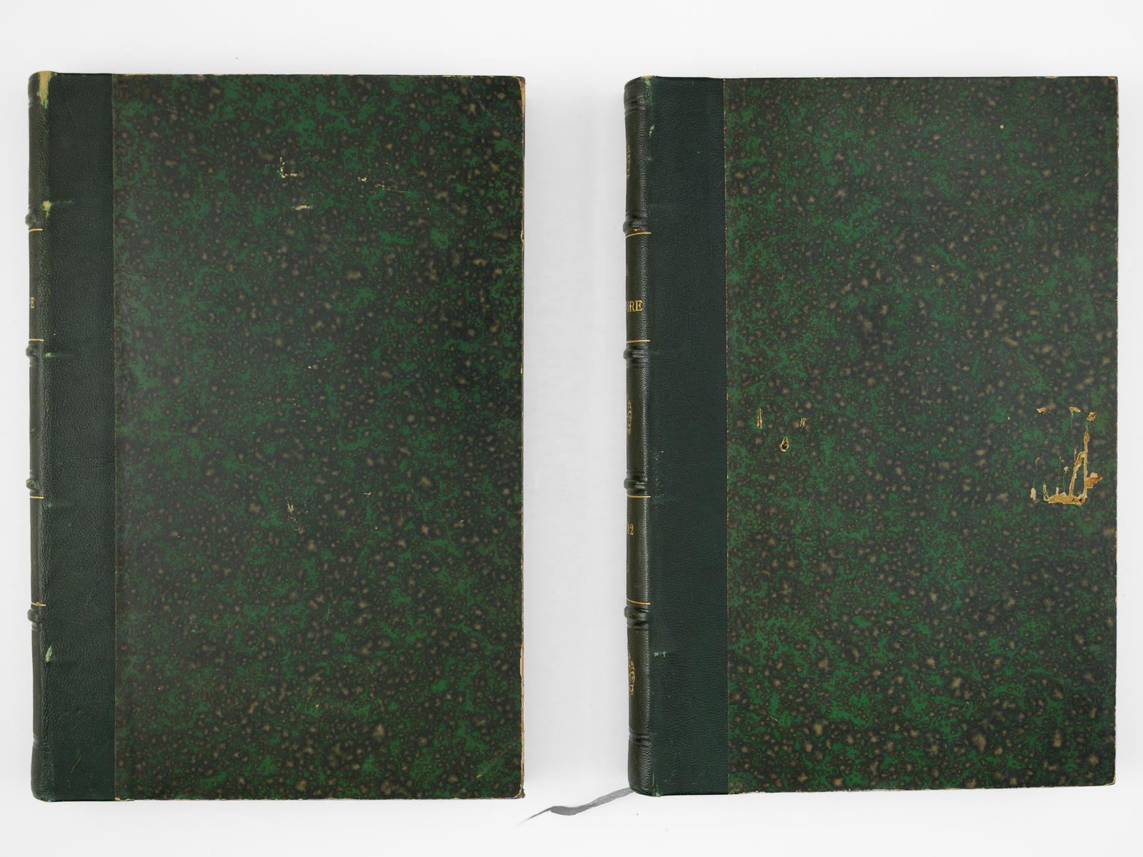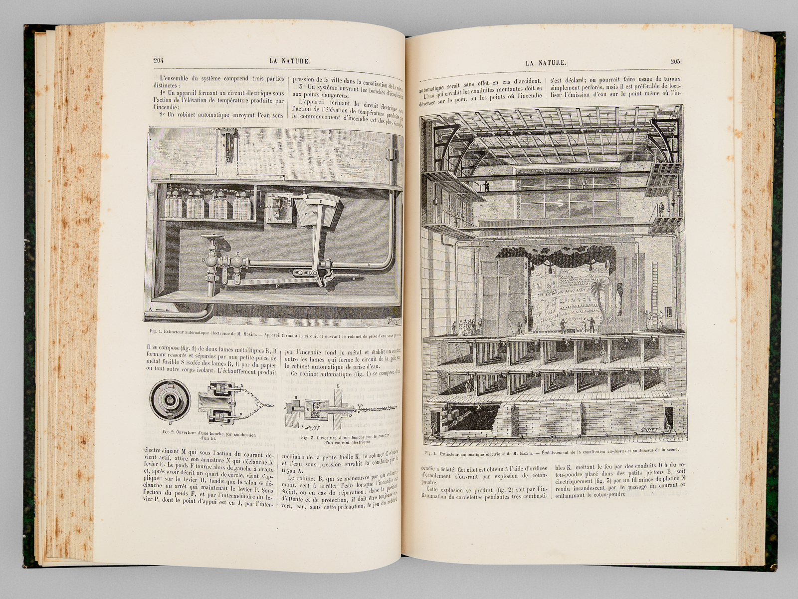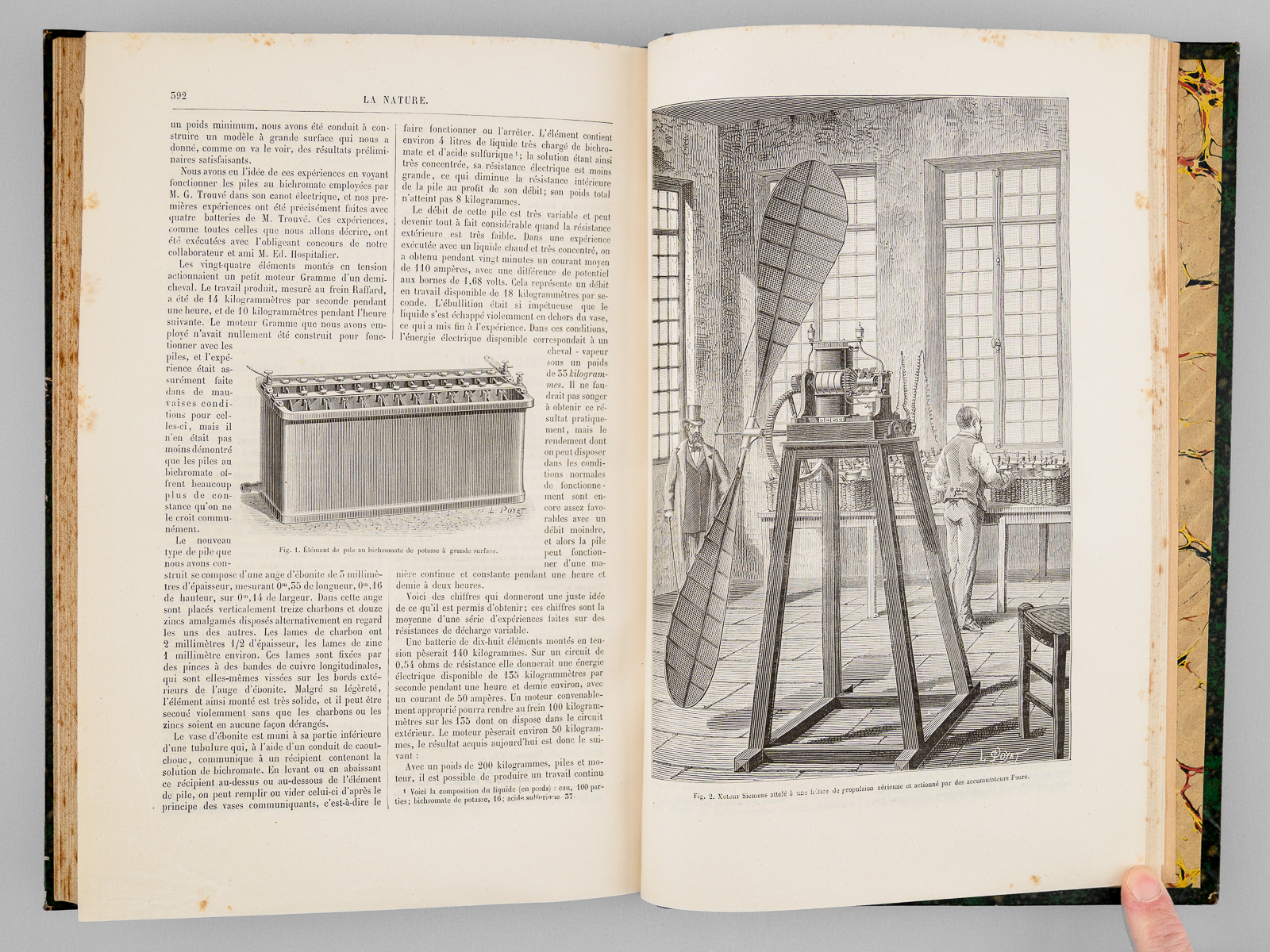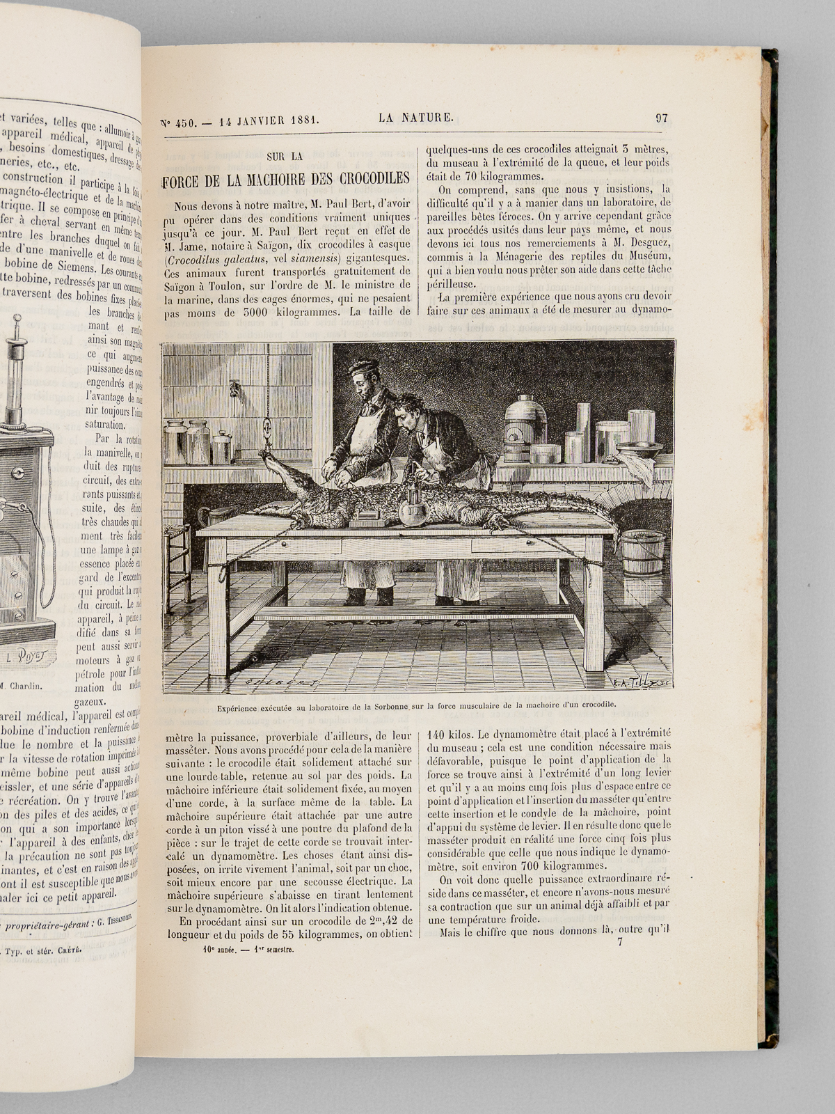 2 vol. in-4 rel. demi-chagrin vert, dos à 4 nerfs, G. Masson éditeur, Paris, 1882, 427 et 427 pp. Au Sommaire notamment : Le télégraphe de Bourse « Exchange Telegraph Company » de Londres ; L'Écliptique, nouveau moteur électrique ; Le Comité international des poids et mesures ; Nouveau transmetteur radiophonique ; Le praxinoscope à projection ; Nouvelle machine dynamo-électrique à courants alternatifs de M. J. E. H. Gordon ; Tissus et bois ininflammables ; La fermentation butyrique provoquée par la terre arable ; Les grandes dunes de sable du Sahara ; L'Observatoire du Pic du Midi. Spectres lumineux ; Formation des cratères de la lune ; Les lignites de Dixmont ; Une nouvelle espèce de zèbre. Le zèbre de Grévy (Equus Grevyi) ; Le perforateur à air comprimé dans les mines de grisou ; Sur la maladie des ouvriers des tunnels ; Le centenaire de la découverte des aérostats ; Académie des Sciences. Séances hebdomadaires ; Les carrés magiques.