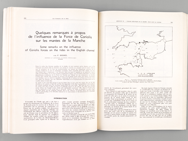 2 vol. in-4 br., Publié par La Houille Blanche, Grenoble, 1957, 751-21 pp. Commentaire : Bon ensemble (couv. lég. frottée) pour ce beau compte-rendu de cet important colloque qui fit date dans la réflexion sur l'énergie de la mer (énergie de la houle, énergie marémotrice, etc...).