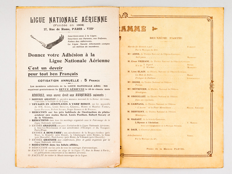 1 brochure in-8 avec un feuillet inséré (prospectus d'adhésion à la ligue), 1913 Commentaire : Le programme contenait une première partie avec diverses allocutions, dont une conférence du Lieutenant-Colonel Paul Renard : 'Dirigeables et Aéroplanes de Guerre', des remises de médailles (médaille d'or à Pierre Daucourt), et des projections cinématographiques, et une deuxième partie musicale. Bon état (très petits frott. ou pliures).