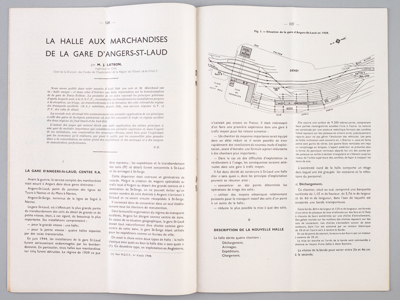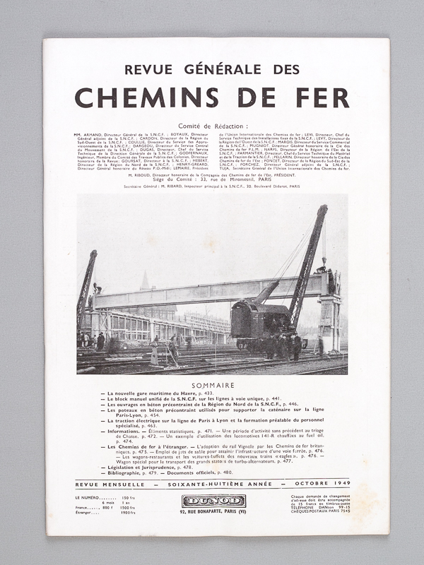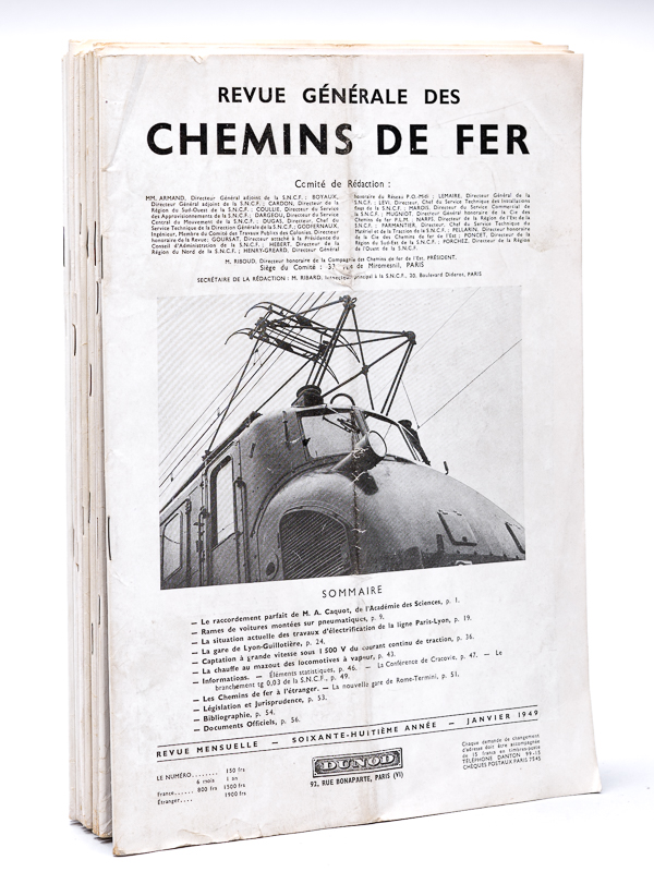 12 numéros in-4 br., Revue Générale des Chemins de Fer, 1949, 580 pp. Au sommaire notamment : La chaïne de fabrication ds wagons à primeurs de la SNCF ; Un autocar sur rails, l'autorail Floirat et sa remorque ; le wagon-instruction freins de la Région du Sud-Ouest ; La théorie de la chaleur et le chauffage électrique des voitures de chemin de fer ; TRains de pélerinage, méthodes utilisées pour la rotation ; La gare de triage de Tergnier ; les locomotives à vapeur type 241-P ; Mesure de la résilience des rails ; La traction Diesel-électrique dans les territoires d'outre-mer ; L'éclairage des chantiers de triage à la SNCF ; l'emploi du sabot enrayage ; les locomotives électriques à courant continu 1500 volts ; rail américain et rail français ; La reconstruction des ponts métalliques de la ligne de Vierzon ; les essais de la première locomotive électrique du prototype CC ; un appareil à enregistrer les chocs des wagons ; la construction en acier doux soudé d'une rame sur pneumatiques ; la transformation des gares de Dijon et Perrigny ; la locomotive électrique CC 7001 ; les transports ferroviaires en zone française d'occupation en Allemagne ; le nouveau triage de Toulouse-Saint-Jory ; la nouvelle gare maritime du Havre ; les poteaux en béton précontraint utilisés pour supporter la caténaire sur la ligne Paris-Lyon ; La traction électrique sur la ligne -ParisLyon et la formation préalable du personnel spécialisé ; Les câbles téléphoniques de la ligne de Paris à Lyon ; Amélioration des locomotives Mikado de la Région de l'Ouest ; La reconstruction du Pont de Roppenheim ; Captation à grande vitesse sous 1500 V du courant continu de traction ; La gare de Lyon-Guillotière. Commentaire : Complet des 12 numéros de l'année 1949. Etat très satisfaisant (qq. couv. lég. frottées). Prix du lot non séparable.